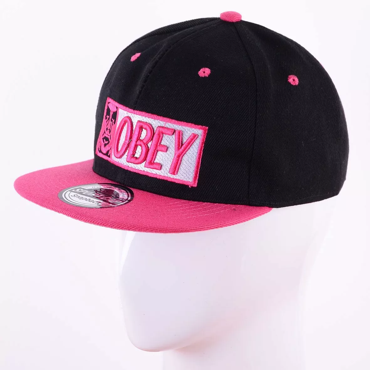 расположена вышивка с надписью – OBEY в тон козырька, сзади