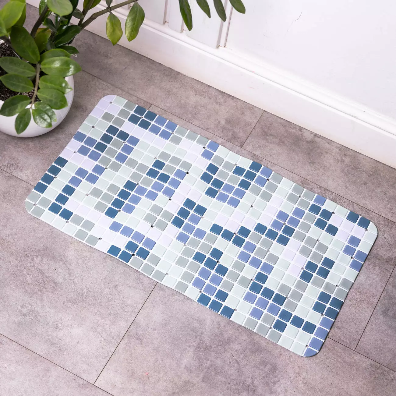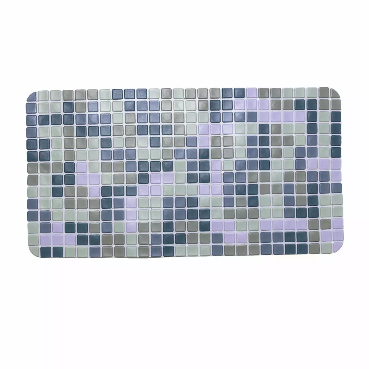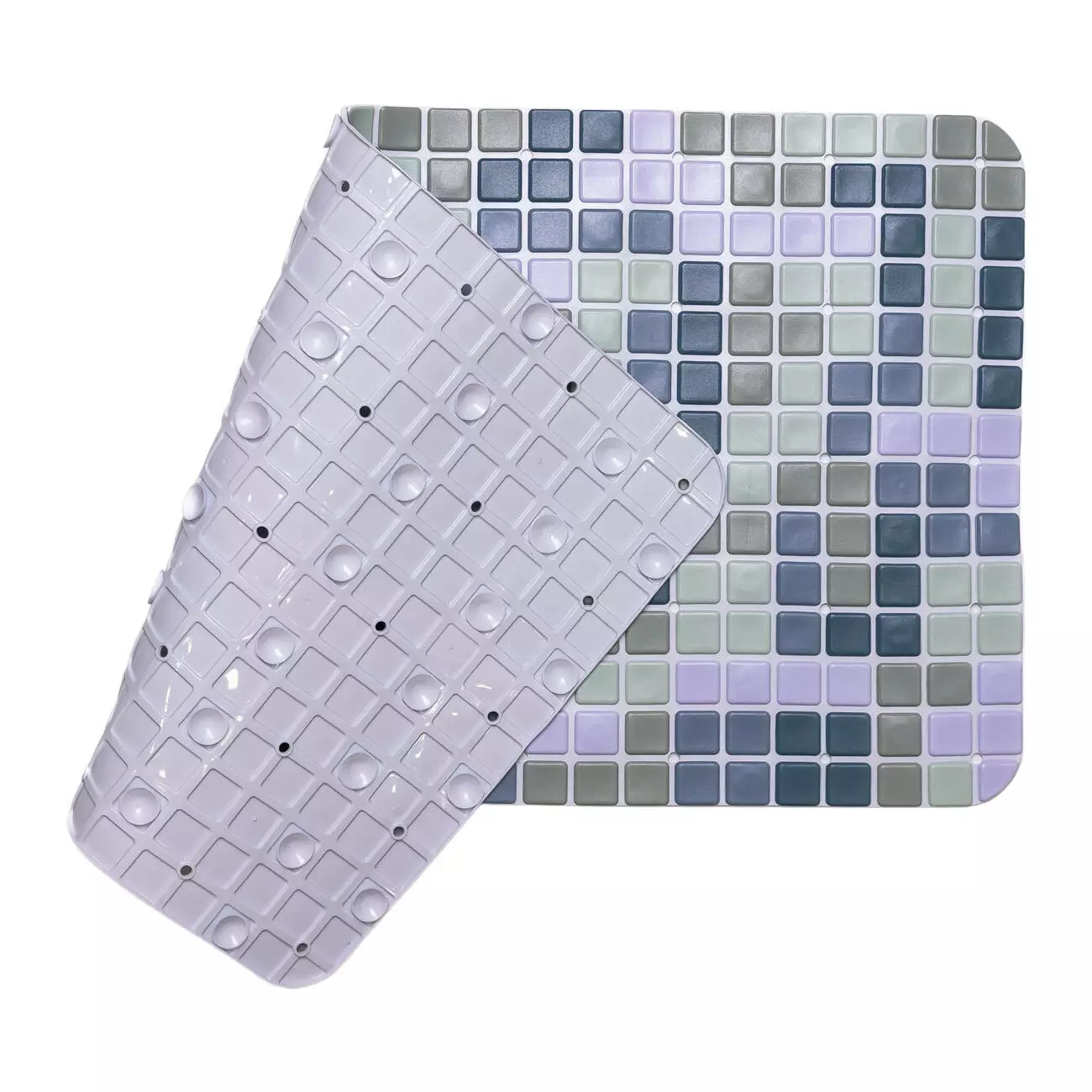 Візерунок виконаний у стилі мозаїки з дрібних квадратних елементів, що формують акуратну та впорядковану поверхню. Рівномірно розподілені отвори виконують функцію дренажу та сприяють кращому зчепленню, запобігаючи накопиченню води. Така структура підвищує комфорт під час використання та робить килимок практичним у щоденному догляді.