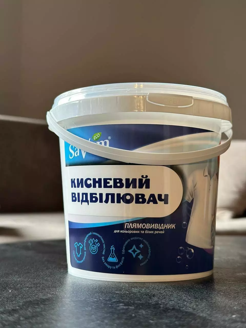 Кисневий відбілювач SaVam відро 950г -ефективний засіб для глибокого очищення та видвлення стійких плям для білих та кольорових речей у зручному пакеванні.