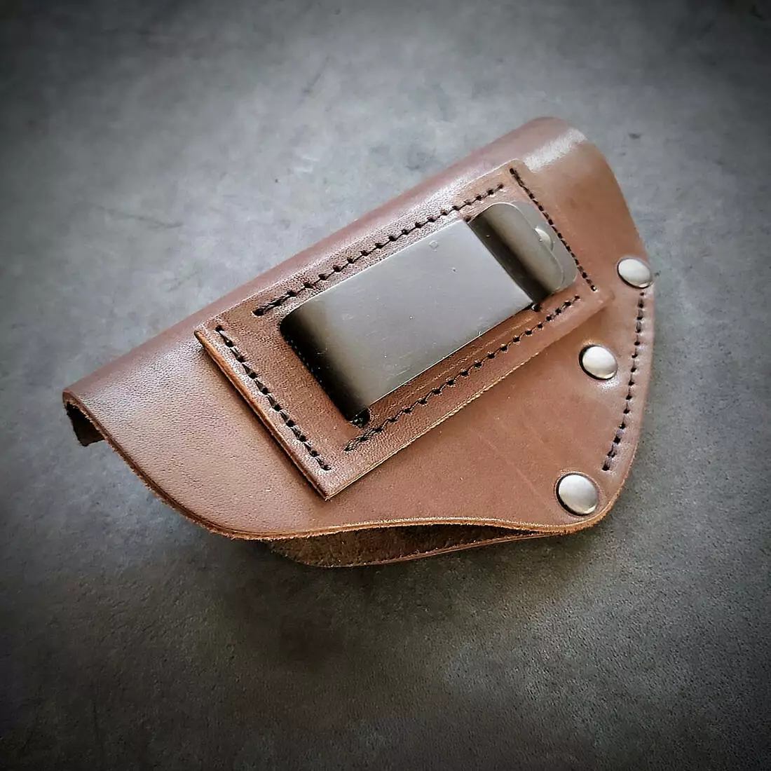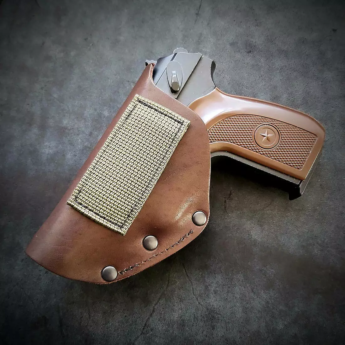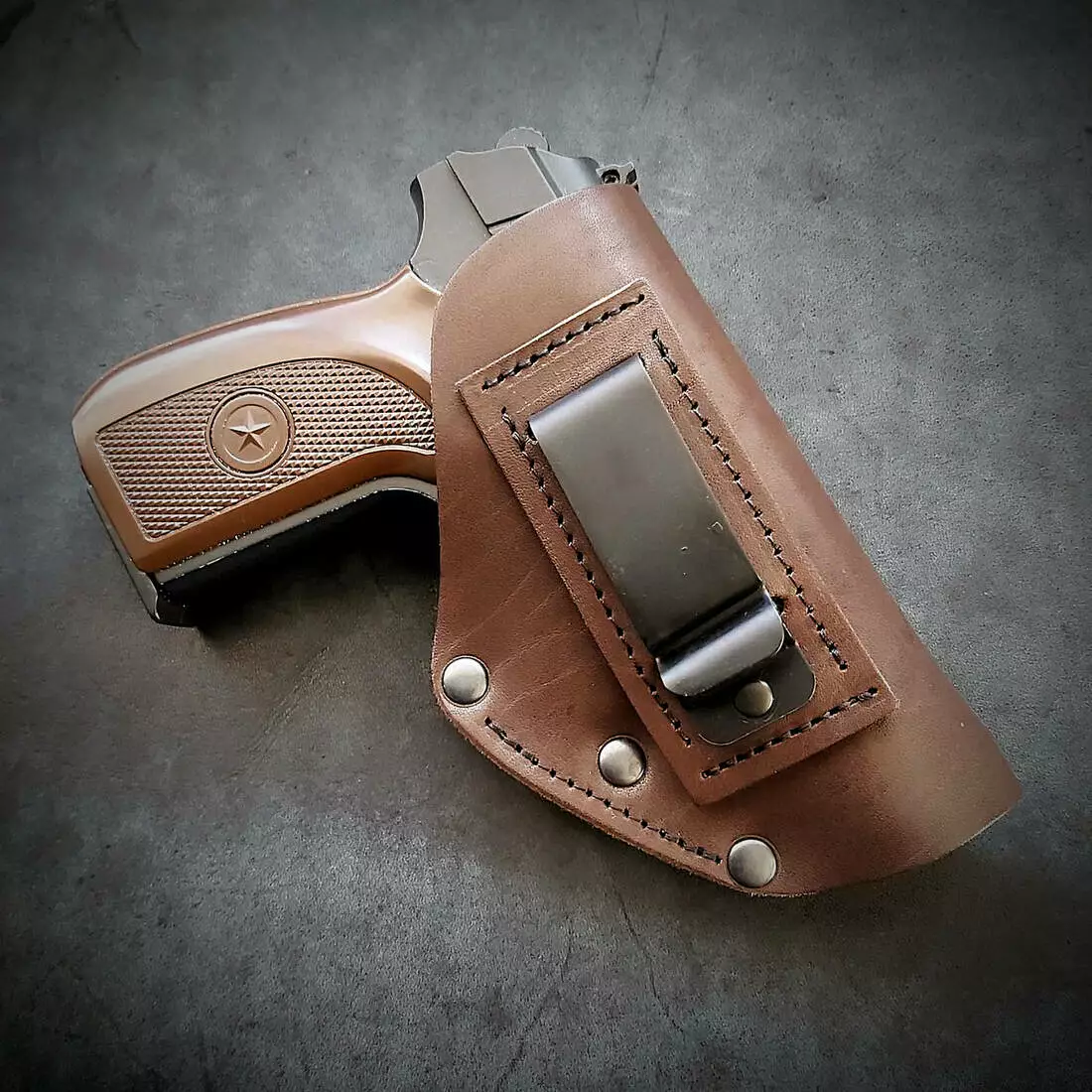 Кобура 2 в 1: поясна/прихованого носіння під ПМ. Підходить під праву та ліву руку (три варіанта носіння). Виконана із щільної шкіри 2.5 мм завтовшки. Колір коричневий