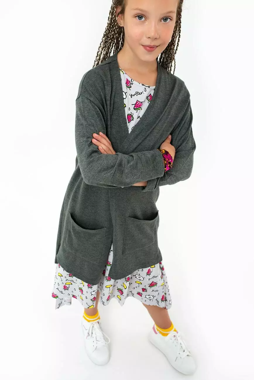 Дитячий кардиган вільного прямого крою з заниженою лінією плеч. Для дівчаток від 5 до 15 років.