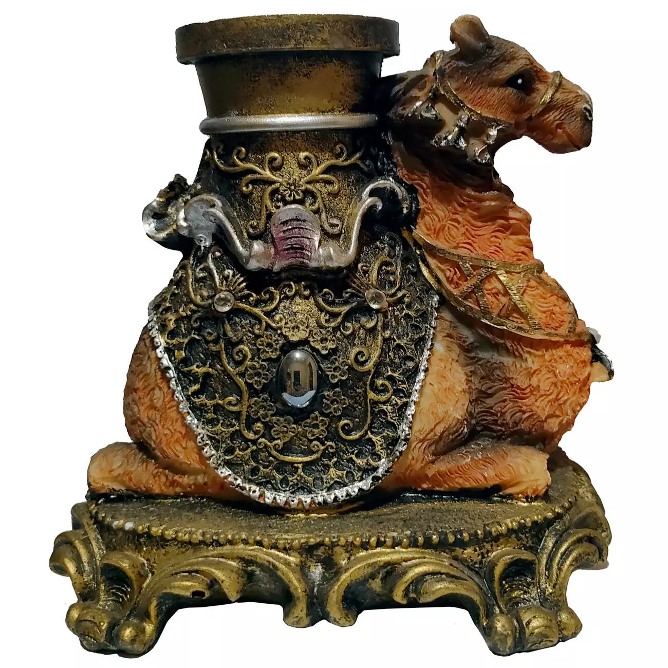 Оригинальная колба для кальяна в виде изящной декоративной статуэтки верблюда. Выполнена в восточном стиле с богатыми узорами и деталями, придающими ей роскошный вид. Отличается прочностью и устойчивостью, а также станет эффектным украшением любого кальяна.