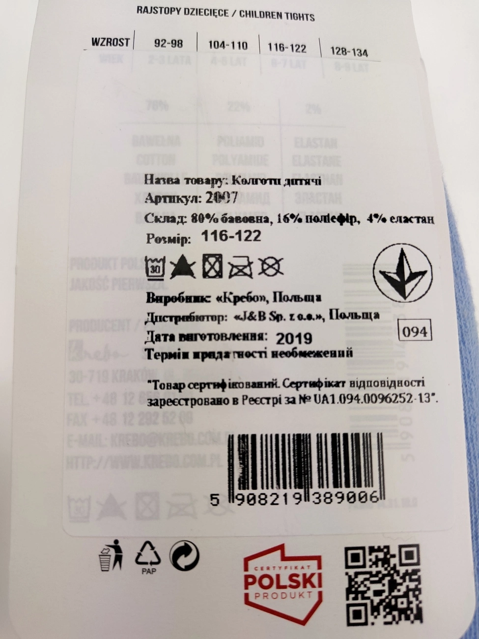 Колготи польського виробника тм Krebo , якісні , мають хороший склад 80%бавовна 16%поліефір 4%еластан .