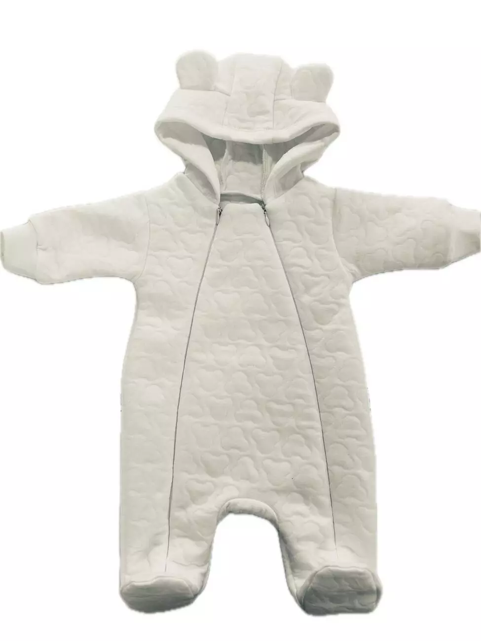 Комбінезон ясельний двошаровий з капюшоном. Застібки - дві потаємні блискавки. Полотно - двошаровий інтерлок, бавовна 100%, із тонким шаром синтепону. Сезон - рання осінь, пізня весна.