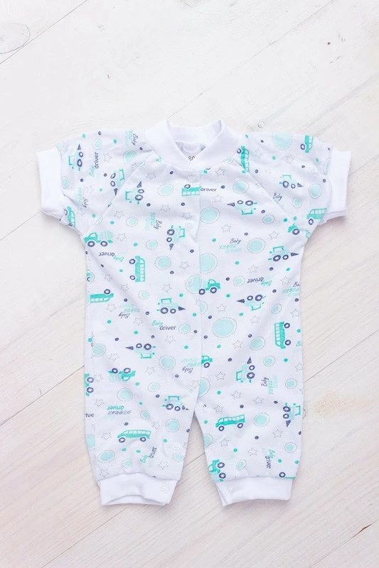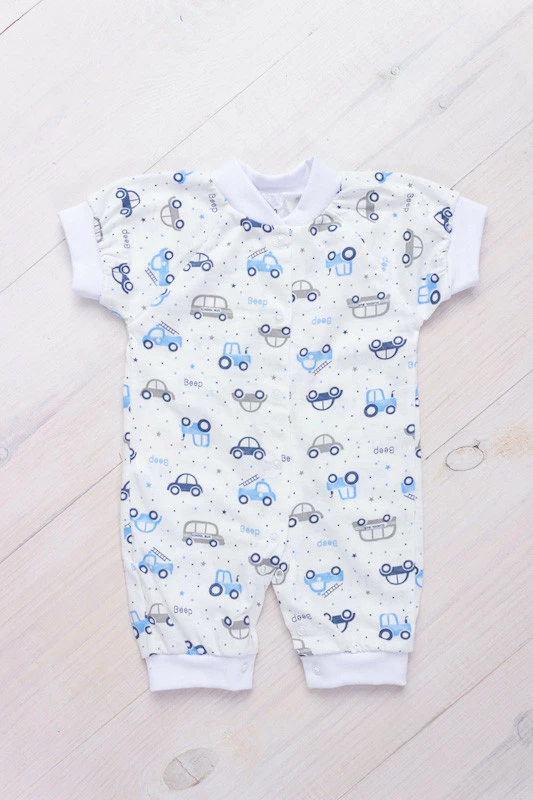 Ясельний комбінезон з коротким рукавом, з принтованого куліру. Виріб з укороченими ніжками, що не розраховано під підгузник. По всій довжині застібається на кнопки.