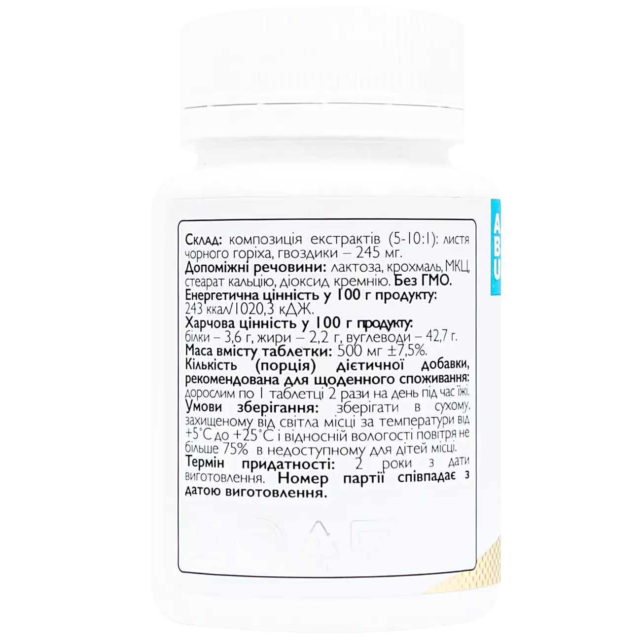 Композиція екстрактів (5-10:1) листя чорного горіху, гвоздики – 245 мг.