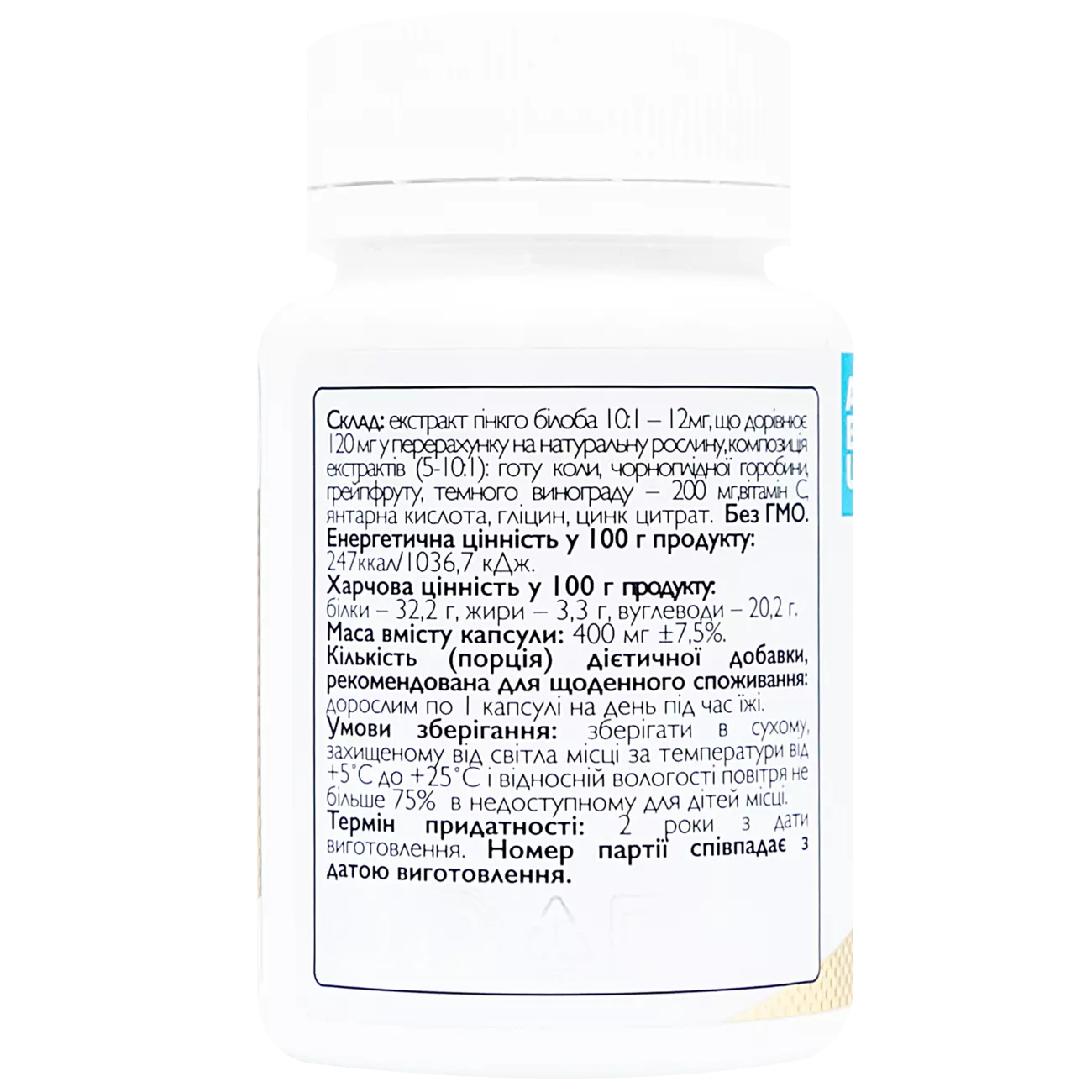 Екстракт гінкго білоба 10:1 – 12мг, що дорівнює 120 мг у перерахунку на натуральну рослину, композиція екстрактів (5-10:1): готу коли, чорноплідної горобини, грейпфруту, темного винограду – 200 мг,вітамін С, янтарна кислота, гліцин, цинк цитрат.