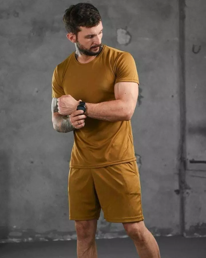 Підготуйтеся до літа з нашим стильним чоловічим комплектом, що містить комфортні шорти та футболку. Шорти виготовлені з легкого дихаючого матеріалу, який ідеально підходить для активного способу життя. У них зручний пояс на зав'язках для ідеальної посадки. Футболка виготовлена з поліестеру, що забезпечує еластичність і комфорт.
