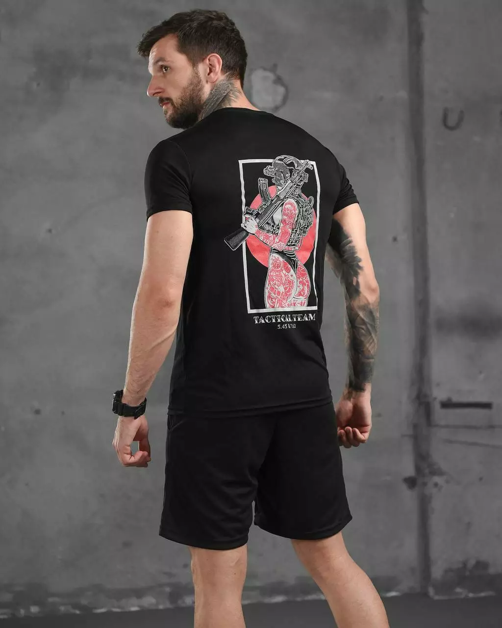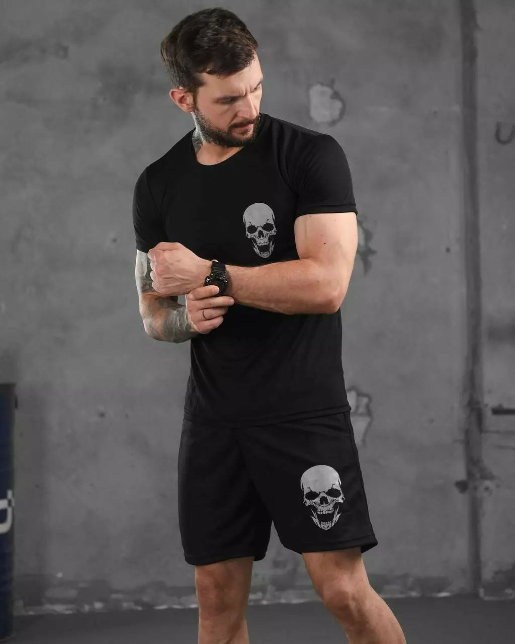 Підготуйтеся до літа з нашим стильним чоловічим комплектом, що містить комфортні шорти та футболку. Шорти виготовлені з легкого дихаючого матеріалу, який ідеально підходить для активного способу життя. У них зручний пояс на зав'язках для ідеальної посадки. Футболка виготовлена з поліестеру, що забезпечує еластичність і комфорт. Вона має стильний принт на грудях і чудово поєднується із шортами.