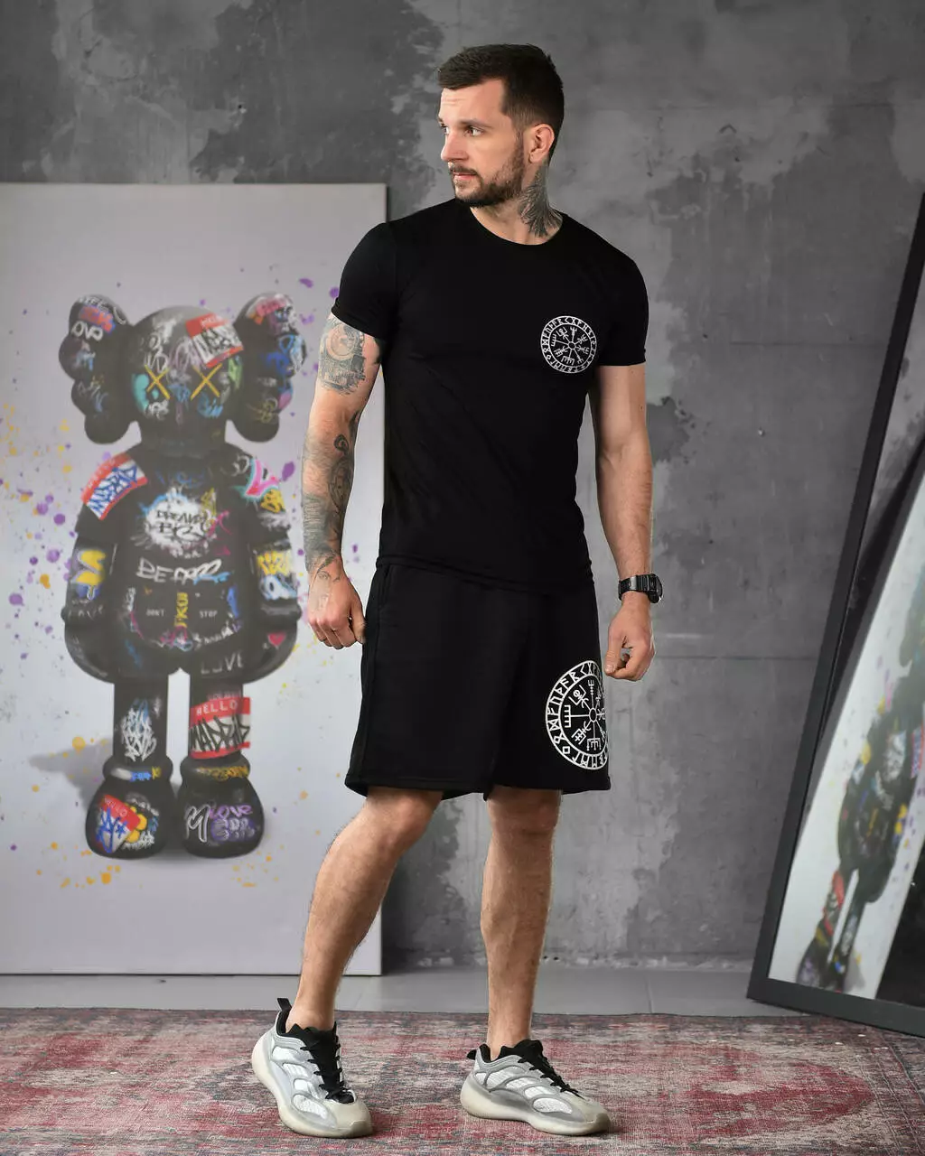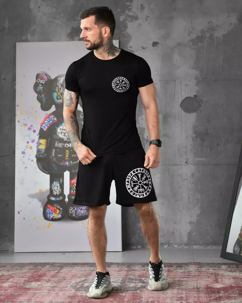 Підготуйтеся до літа з нашим стильним чоловічим комплектом, що містить комфортні шорти та футболку. Шорти виготовлені з легкого дихаючого матеріалу, який ідеально підходить для активного способу життя. У них зручний пояс на зав'язках для ідеальної посадки. Футболка виготовлена з поліестеру, що забезпечує еластичність і комфорт. Вона має стильний принт на грудях і чудово поєднується із шортами.