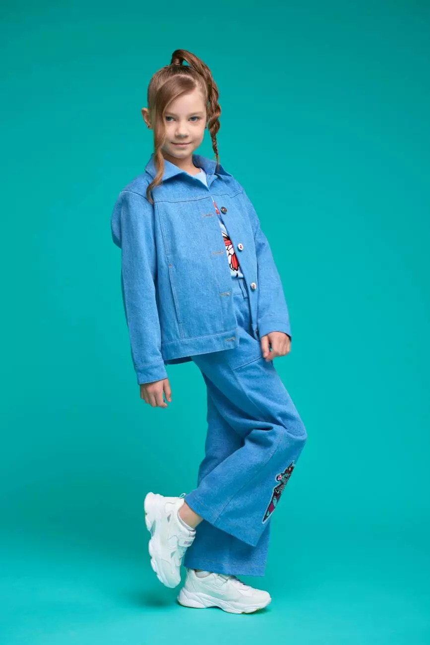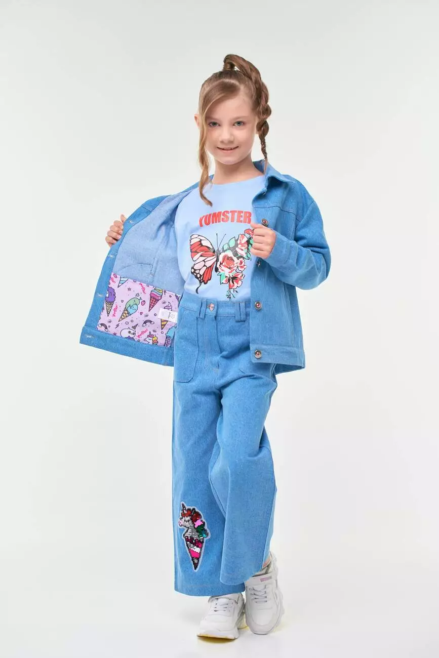 Низ: джинси світло-блакитного кольору. Середня посадка. Штанини злегка розширені до низу, з фігурними накладними кишенями по переду та аплікацією з двосторонніх паєток у вигляді Єдинорога. Середня посадка. Застібка на блискавці. В пояс по спинці вставлена ​​резинка, на пояс нашиті шльовки. Ззаду штанів кокетка, відстрочена по шву обробною ниткою. Також, обробною ниткою відстрочені всі шви джинсів.