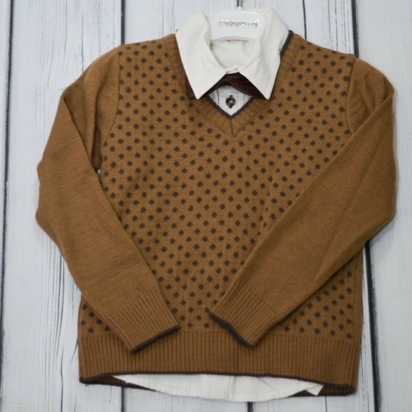 Актуальный и универсальный комплект для школьников младших классов в бежевом цвете станет приятным открытием для родителей по качеству и цене изделий, а детей порадует комфортом и стильными дизайнерскими решениями. Комплект-тройка для детей 6-9 лет состоит из темно-коричневых брюк, рубашки с ярким орнаментом в подходящей цветовой гамме, а также свитера цвета «кофе с молоком».