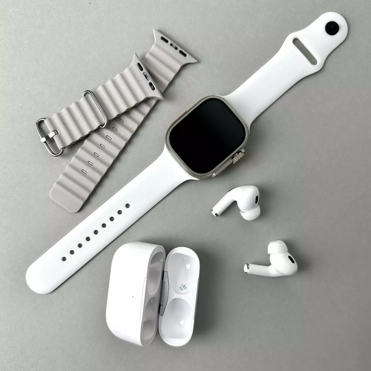 Комплект HR5 Ultra 3 (Watch Ultra + Air Pro 2) – это стильное и функциональное решение для современного пользователя, сочетающего смарт-часы с двумя сменными ремешками и TWS-наушники. Он создан для тех, кто хочет поддерживать активный образ жизни, быть на связи и выглядеть на все 100%. Часы помогают следить за здоровьем и активностью, а наушники обеспечивают качественный звук без проводов – все это в одном комплекте, готовом к использованию или в качестве подарка.