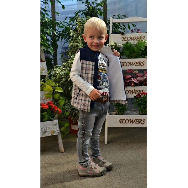 Удобная теплая куртка-жилет в клетку не будет сковывать движений своего маленького хозяина, надежно защищая при этом от холода в нестабильную осенне-весеннюю погоду.