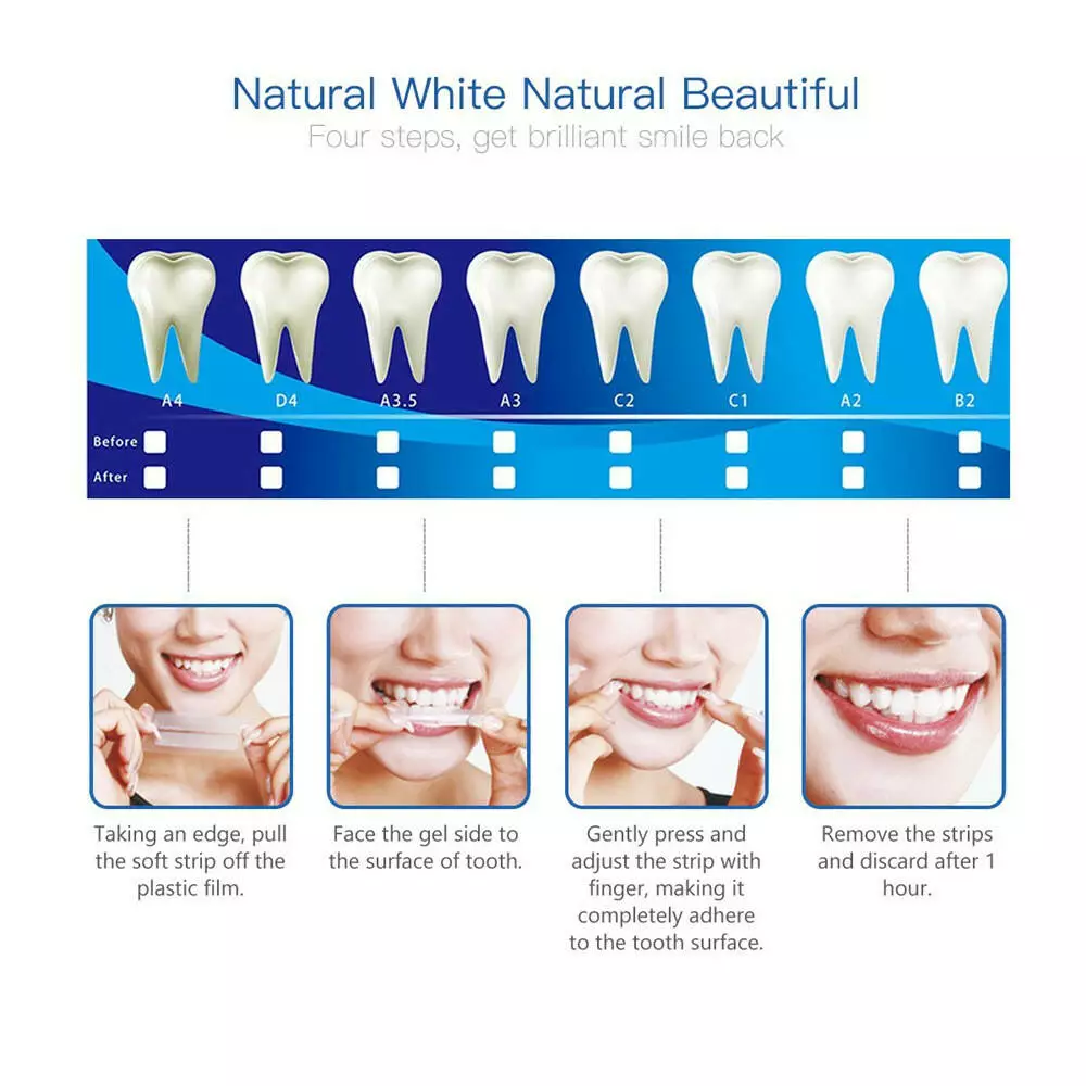 Способ применения: Применять всего 1 раз в день по 30 минут. Этот набор приравнивается к профессиональному отбеливанию. В один пакетик входит две полоски (на верхнюю и на нижнюю челюсть). Полоски легко наклеиваются на зубы. Можно пить воду, свободно разговаривать.