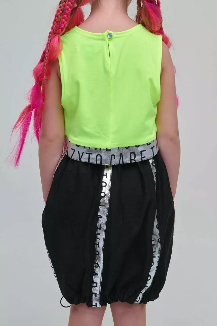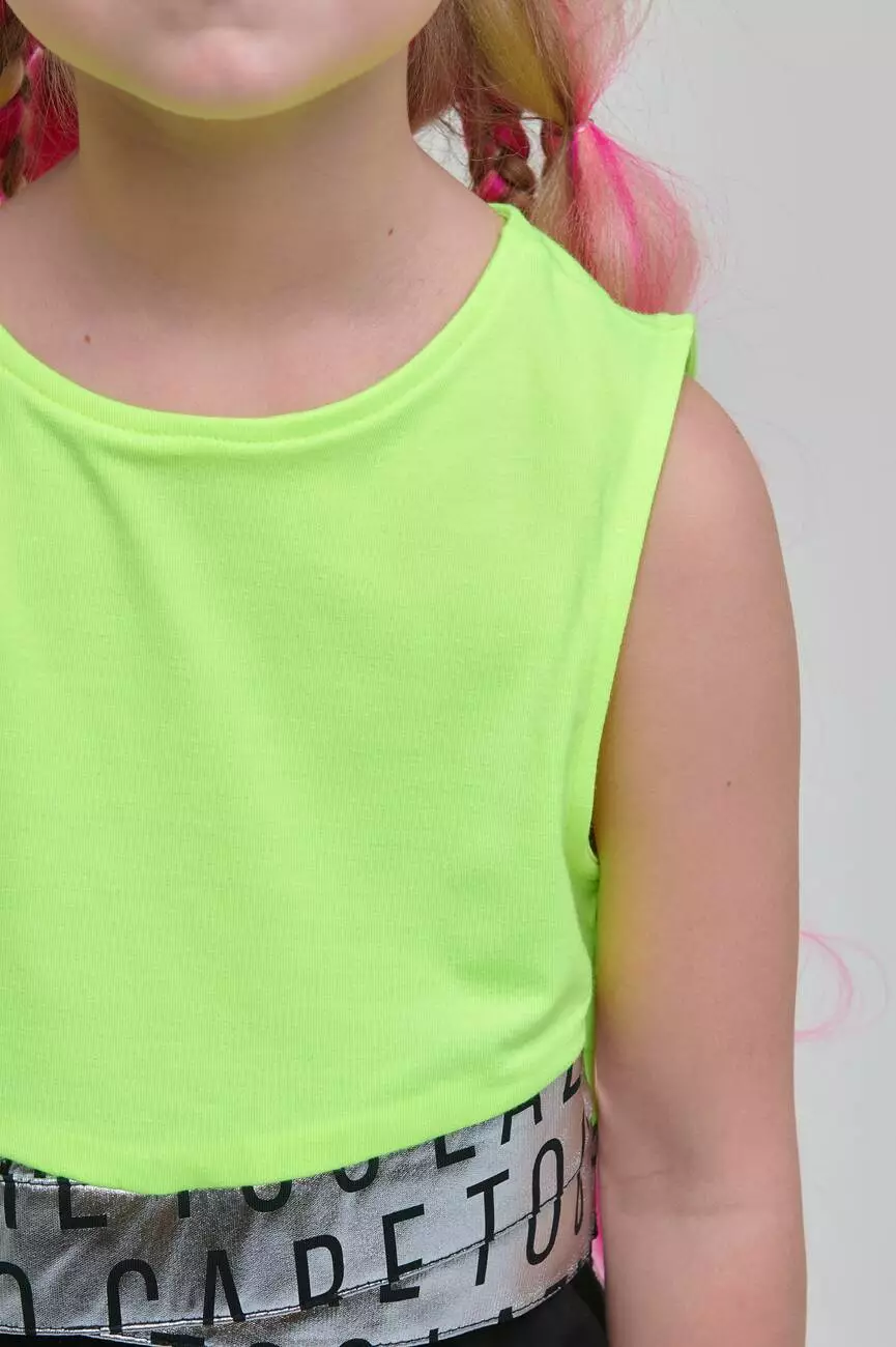 - Топ салатовий. Укорочена довжина. Кругла горловина. Без рукавів. Внизу срібна широка вставка із чорним принтом. Застібка - ззаду ґудзик.