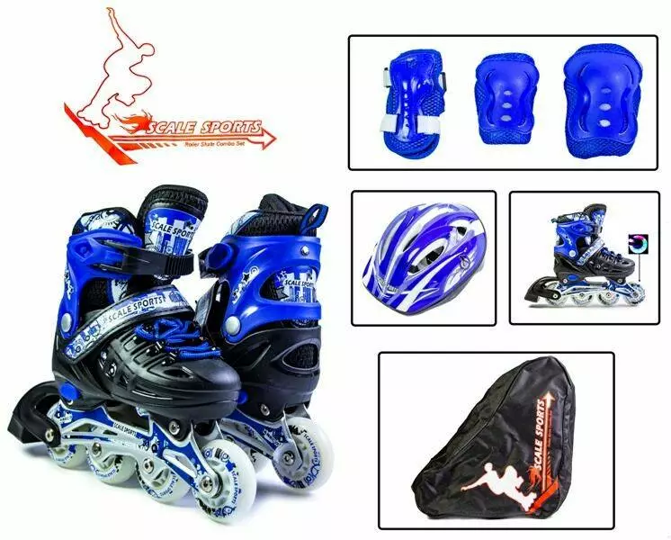 <p>Комплект<strong> "Scale </strong>Sports<strong>"  </strong>предназначены для тех, кто любит качество и надежность. Покупая комплекты<strong> </strong><strong>"Scale </strong>Sports<strong>"</strong><strong> </strong>, вы одновременно получаете сразу целый набор всех необходимых элементов: качественные ролики,надежную защиту на руки и ноги, а также прочный красивый шлем.</p><br /> <p>Описание и преимущества Комплекта <strong>"Scale </strong>Sports<strong>"</strong>:</p><br /> <ul><br /> <li>изделие американской торговой марки <strong>"Scale </strong>Sports<strong>"</strong>;</li><br /> <li>стелька 18-20,5 см</li><br /> <li>удобство застежек и прочное крепление стопы - шнуровка, бакля AUTОLOCK и пяточный ремень;</li><br /> <li>система торможения сзади;</li><br /> <li>полипропиленовая манжета и оболочка - для надежности и удобств, а также "сеточка" - воздухопроницаемость и комфорт;</li><br /> <li>прочная алюминиевая рама;</li><br /> <li>мягкий и бесшумный ход колес - подшипники ABEC-7;</li><br /> <li>возможность регулировки на 4 размера - кнопочная система;</li><br /> <li>РU-колеса из полиуретана (размер 64-70*24 мм);</li><br /> <li>уровень жесткости колес - 82А;</li><br /> <li>в продаже следующие размеры: 29 - с возможностью регулировки до 33, 34 - до 37;38- до 41.</li><br /> <li>расцветка: синий .</li><br /> </ul><br />
