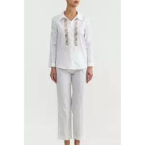 Мереживо, яке оздоблює цей комплект, додає образу витонченості та романтичності, підкреслюючи жіночність та особливий стиль. Ніжні мереживні деталі надають піжамі елегантного акценту, роблячи її більш святковою та витонченою. Мереживо розміщене так, щоб не викликати дискомфорту, воно приємне до шкіри та додає естетичної довершеності. Це тонкий, але виразний акцент, який перетворює піжаму на витвір домашнього одягу, підходящий навіть для особливих моментів.