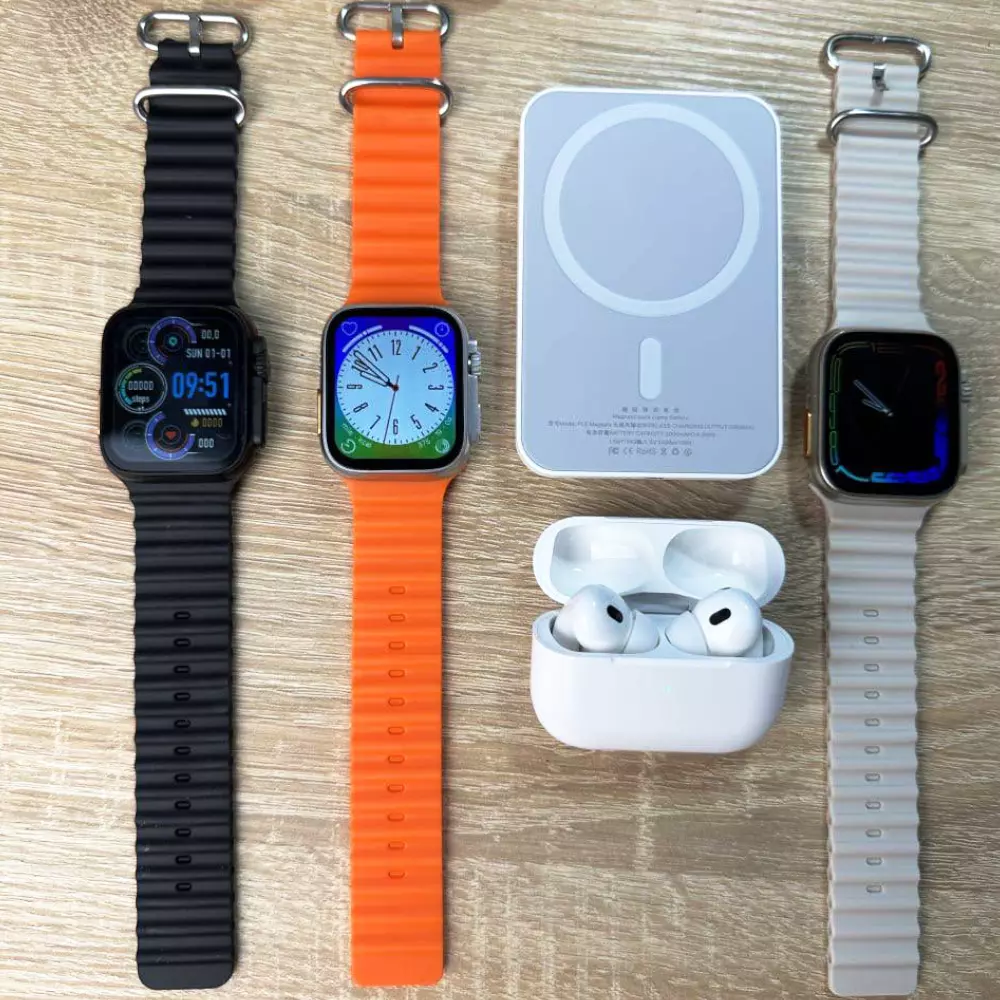 Комплект Ultra Pro 6в1 - Ідеальне поєднання стилю, функціональності та якості, яке стане незамінним у вашому повсякденному житті. Він містить шість якісних позицій, які забезпечать комфорт, зручність і допоможуть вам впоратися з будь-якими завданнями, чи то робота, відпочинок, чи то заняття спортом. Насолоджуйтесь від бездротової зарядки 220 Вт для вашого пристрою і від MagSafe Battery Pack, що йдуть в комплекті. Супер якісний годинник Ultra 8 серії, і нова модель навушників Air Pro 2 - роблять цей комплект дуже вигідним для покупки. Також в комплекті є блок живлення, і всі необхідні кабелі для зарядки всіх гаджетів. Цей набір - універсальне рішення для тих, хто цінує сучасні технології і не готовий йти на компроміси в питаннях якості. Відмінно підійде на подарунок собі та своїм близьким. Це дуже вигідний комплект з корисних пристроїв