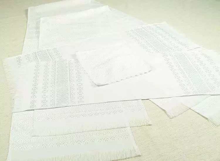 Білосніжні рушники і серветка з тканим орнаментом. Орнамент (Алатир) виконаний блискучими нитками, що надає цим весільним рушникам урочистості. Тканий орнамент поблизу виглядає як вишивка гладдю, а за ціною набагато доступніше.