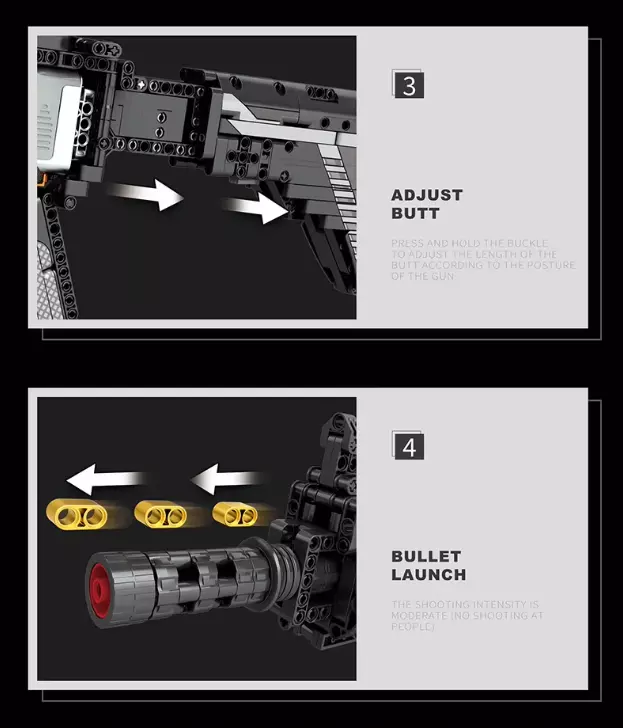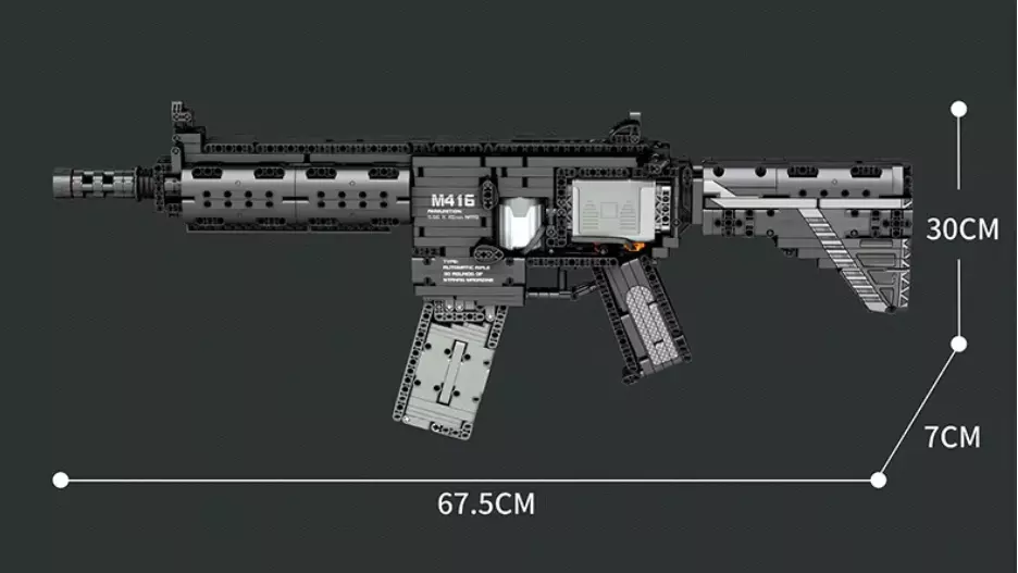 Розміри зібраної гвинтівки становлять 67.5 х 30 х 7 см. Конструктор