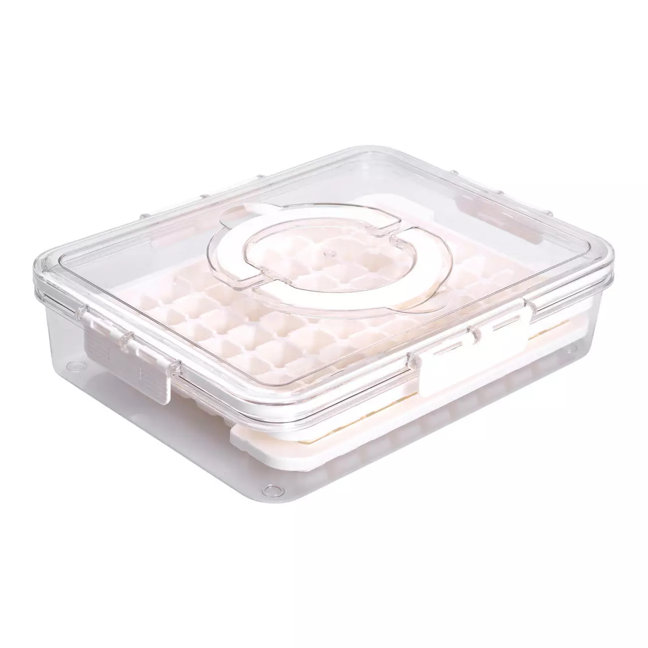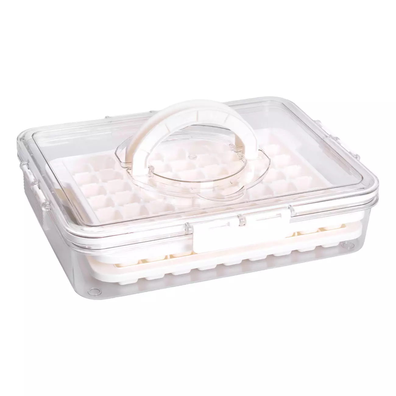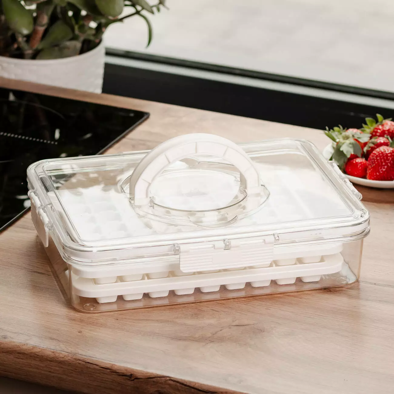 Пластиковий контейнер для льоду розміром 30.5*24*7 см призначений для зручного приготування та зберігання великої кількості кубиків льоду. Всередині розміщено дві знімні форми, кожна з яких має по 63 комірки, що дає змогу одночасно отримати 126 кубиків. Контейнер з кришкою допомагає уникнути потрапляння сторонніх запахів із морозильної камери, а також дозволяє компактно зберігати готовий лід.