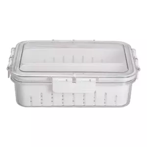 см призначений для організованого зберігання овочів, фруктів, зелені або дрібних харчових продуктів у холодильнику. Його прямокутна форма забезпечує зручне розміщення на полицях, а прозорі стінки дозволяють бачити вміст без потреби відкривати кришку. Контейнер обладнаний двома окремими решітчастими секціями, які забезпечують циркуляцію повітря навколо продуктів та запобігають накопиченню вологи.