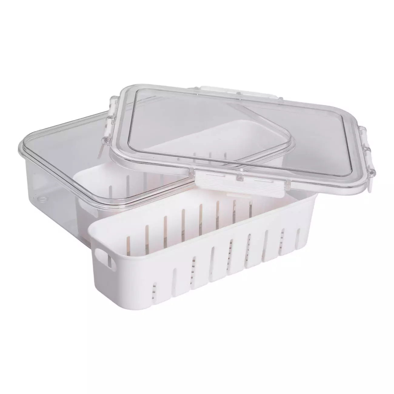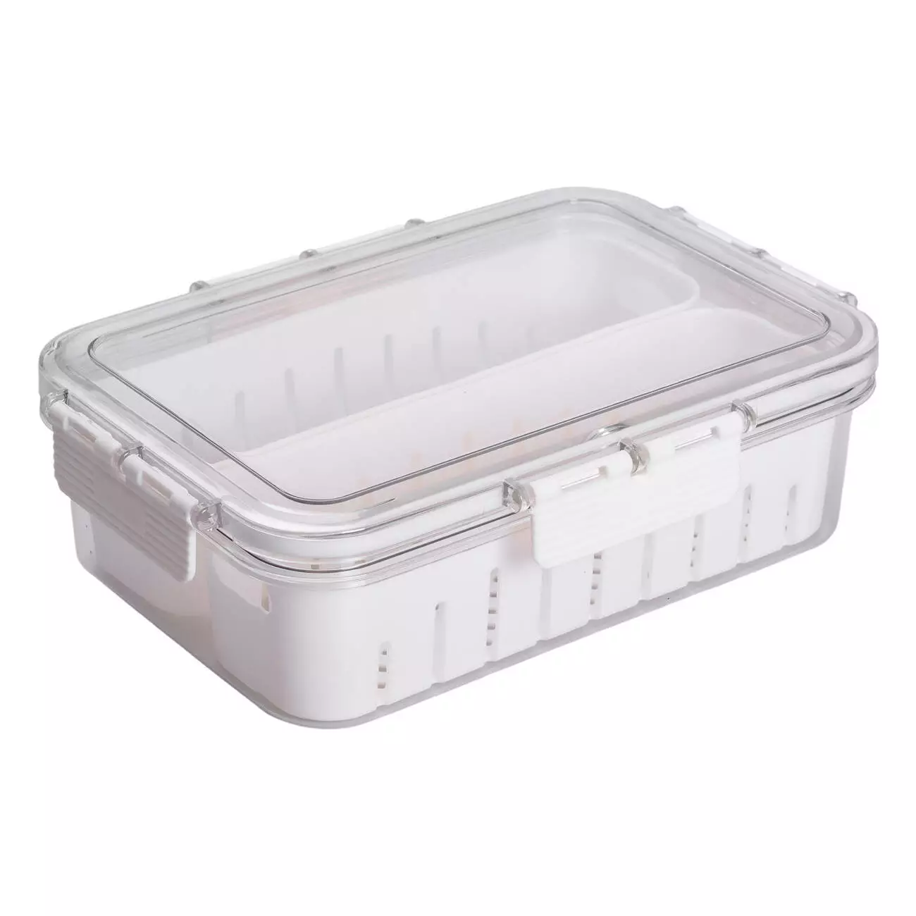 Роздільні секції дозволяють зберігати різні продукти одночасно, не змішуючи їх між собою. Завдяки решітчастій основі продукти не лежать у воді, що позитивно впливає на термін їхньої свіжості. Така конструкція ідеально підходить для холодильного зберігання попередньо вимитих ягід, листової зелені, порізаних овочів або фруктів.