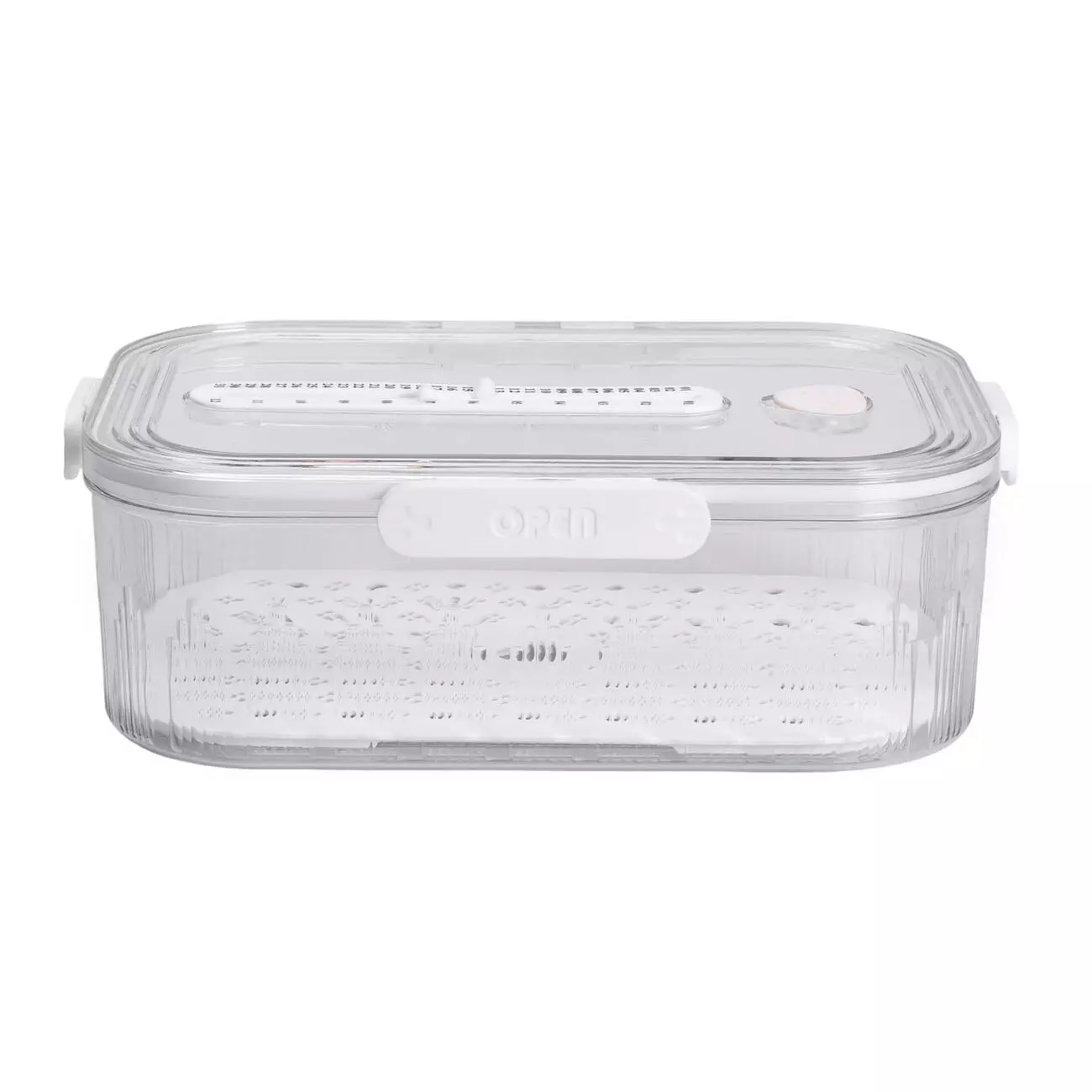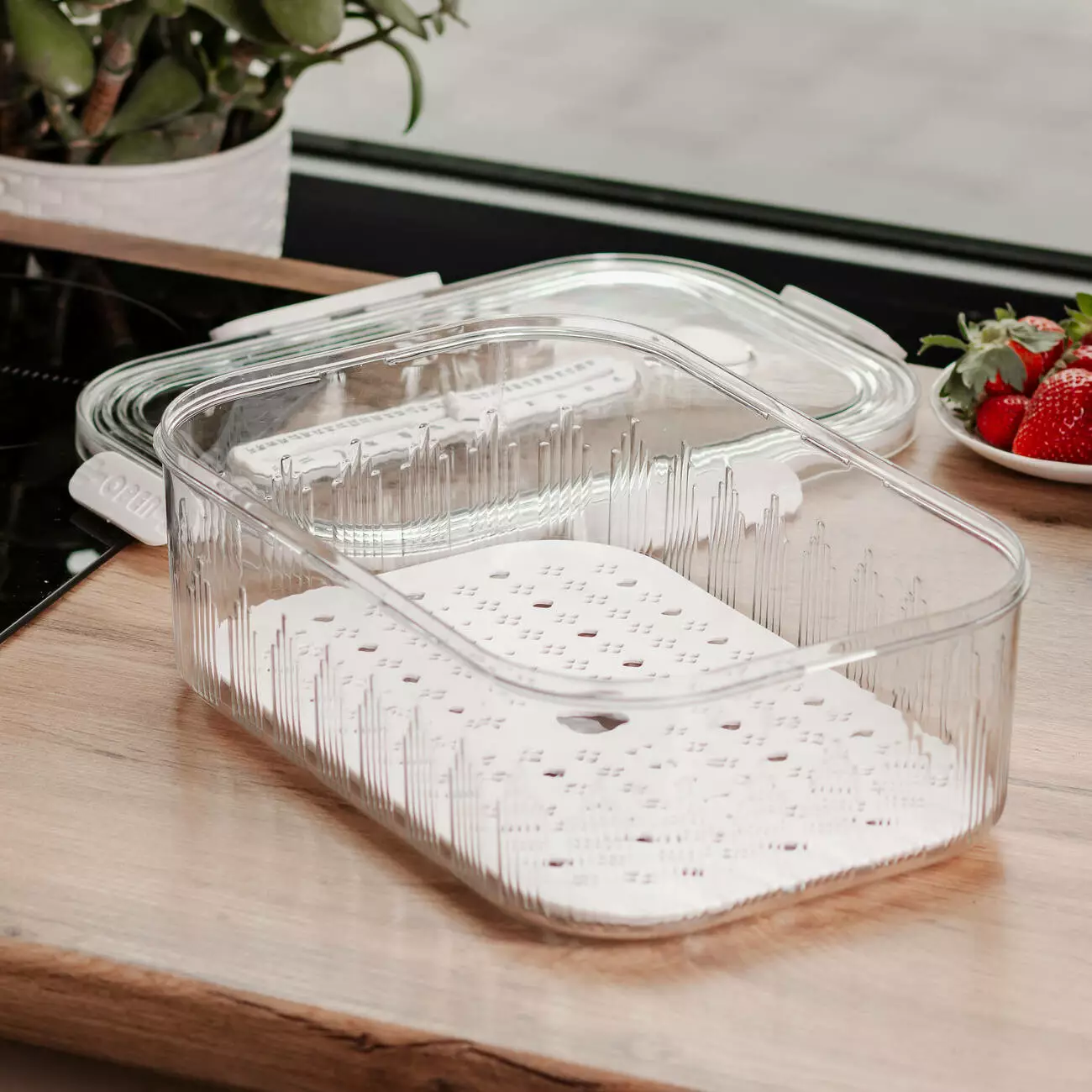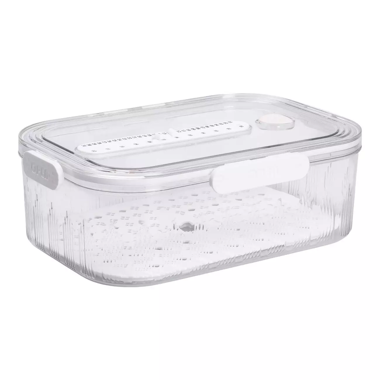 На дні контейнера розміщена знімна дренажна підставка, яка відокремлює продукти від зайвої вологи, захищаючи їх від передчасного псування. Така конструкція особливо зручна для зберігання ягід, зелені або промитих овочів. На кришці передбачено рельєфну шкалу, що виконує функцію вимірювального індикатора — її можна використовувати для оцінки висоти продуктів.