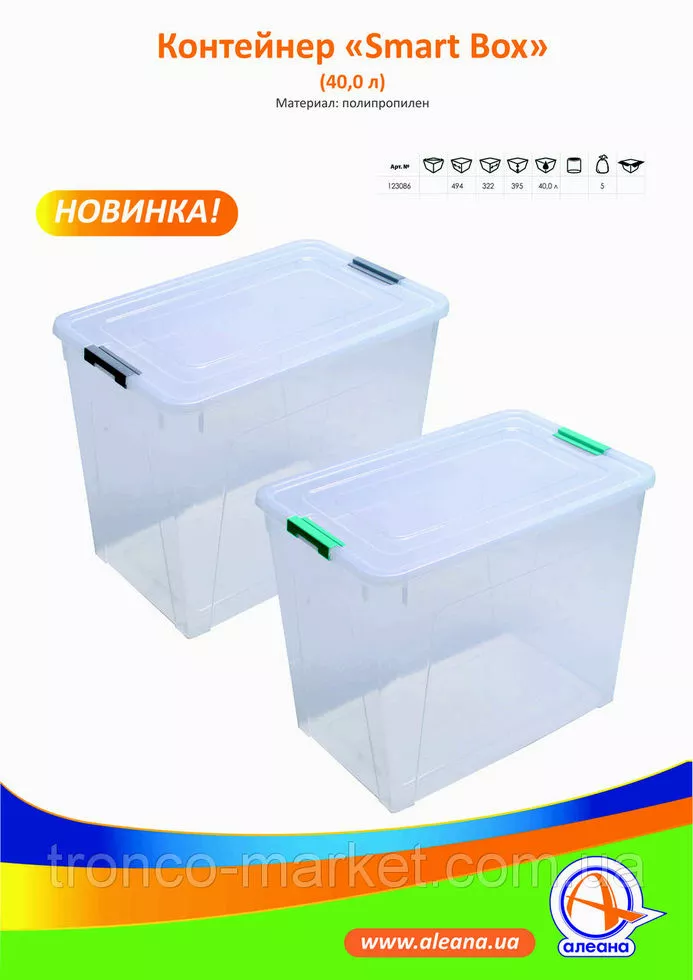 Новинка от украинского производителя АЛЕАНА - умные коробочки для хранения различных предметов на любой вкус. Разработан с целью помочь вам грамотно организовать хранение вещей в вашем доме. ?зготовлен из качественного полипропилена, удобный и вместительный. В нем можно хранить хранить ювелирные украшения, косметику и другие необходимые вещи. Оптимально подобранные объемы смартбоксов удивят вас своим разнообразием : 0,175 л ; 0,375 л; 0,4 л; 0,8л; 1,7 л; 3,5л ; 3,8л ; 7,9 л; 14л ;27л; 40 л . Линейка смартбоксов предлагает три вида контейнеров : простые прозрачные смартбоксы, прозрачные смартбоксы с органайзером, цветные смартбоксы спринг. Все они имеют ровную правильную форму, которая максимально позволит съэкономить пространство, имеют крепкие зажимы для надежного хранения.Правильно организованное хранение,при этом еще и радущее глаз гарантирует порядок в доме и в мыслях. Проверьте на себе! :)