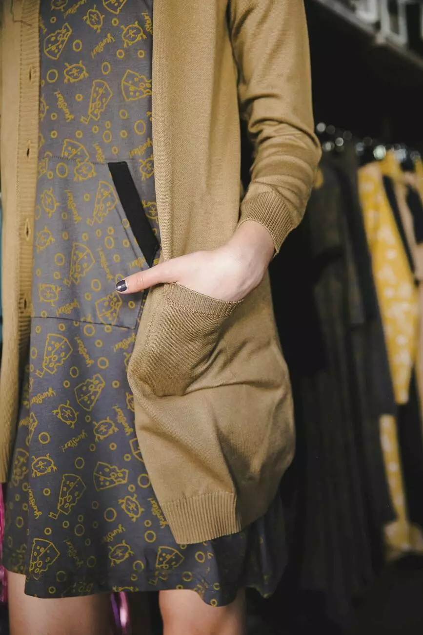 Спереду дві кишені. V-подібний виріз горловини. Тканина - в'язаний