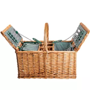 Кошик виготовлений з екологічних матеріалів та повністю укомплектований необхідним для пікніка посудом, який фіксується ременями з екошкіри. Набір столового приладдя розрахований на 4 особи: