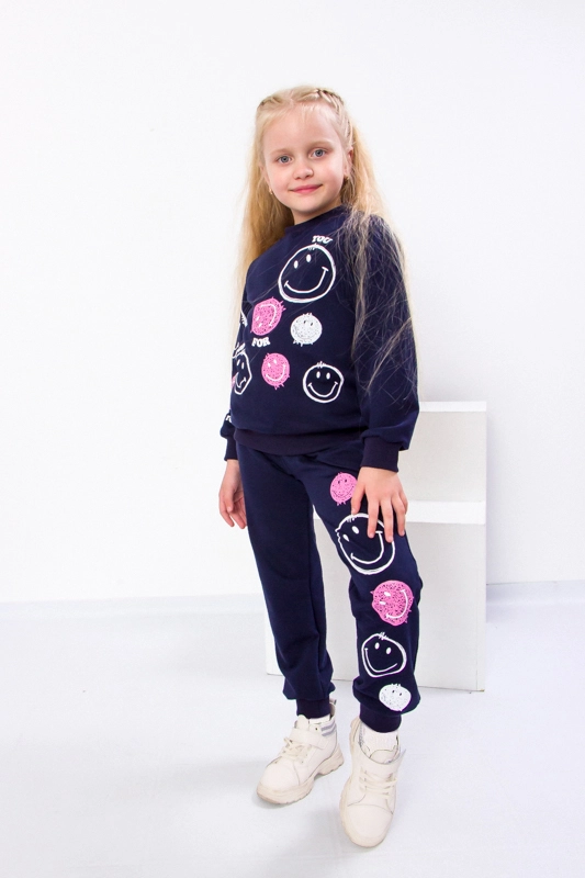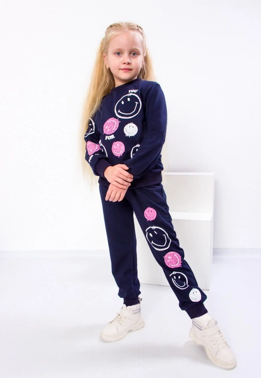 Гарний темно-синій спортивний костюм для дівчинки від компанії «Трикотажний Край» складається з високоякісної бавовни і 10% еластану, тому володіє відмінною ізносостійкістью, довговічністю і приємною тактильністю. Така комбінована тканина відмінно зберігає тепло, зігріваючи ніжну дитячу шкіру, і пропускає повітря. Кофта доповнена стрейчевими манжетами на рукавах, горловині, і по низу виробу, особлива принадність - мерехтливий принт на рукавах і по переду виробу. Низ штанів оснащений еластичними вставками, а пояс - гумкою, яка забезпечує хорошу фіксацію, але не тисне. Оригінальний, стильний дизайн і зручний крій костюма допоможе дівчинці відчувати себе модною, привабливою і впевненою в собі.