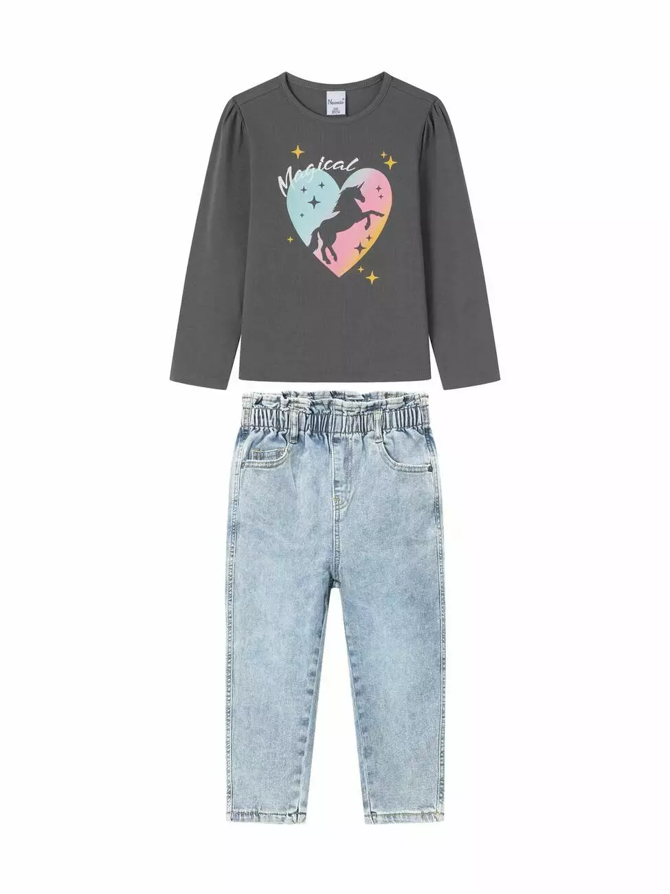 Лонгслів темно-сірого кольору. Довгий рукав. Круглий виріз. Прямий крій. На грудях крутий принт - єдиноріг у серці. У складі тканини присутній невеликий відсоток синтетики - це дозволяє зберегти ідеальний зовнішній вигляд виробу після безлічі прань. Джинси блакитного кольору. Штанини прямі, вільного крою. Ззаду дві накладні кишені, спереду дві кишені з віддільним бочком. Висока талія, на широкій резинці. Є петлі для ременя.