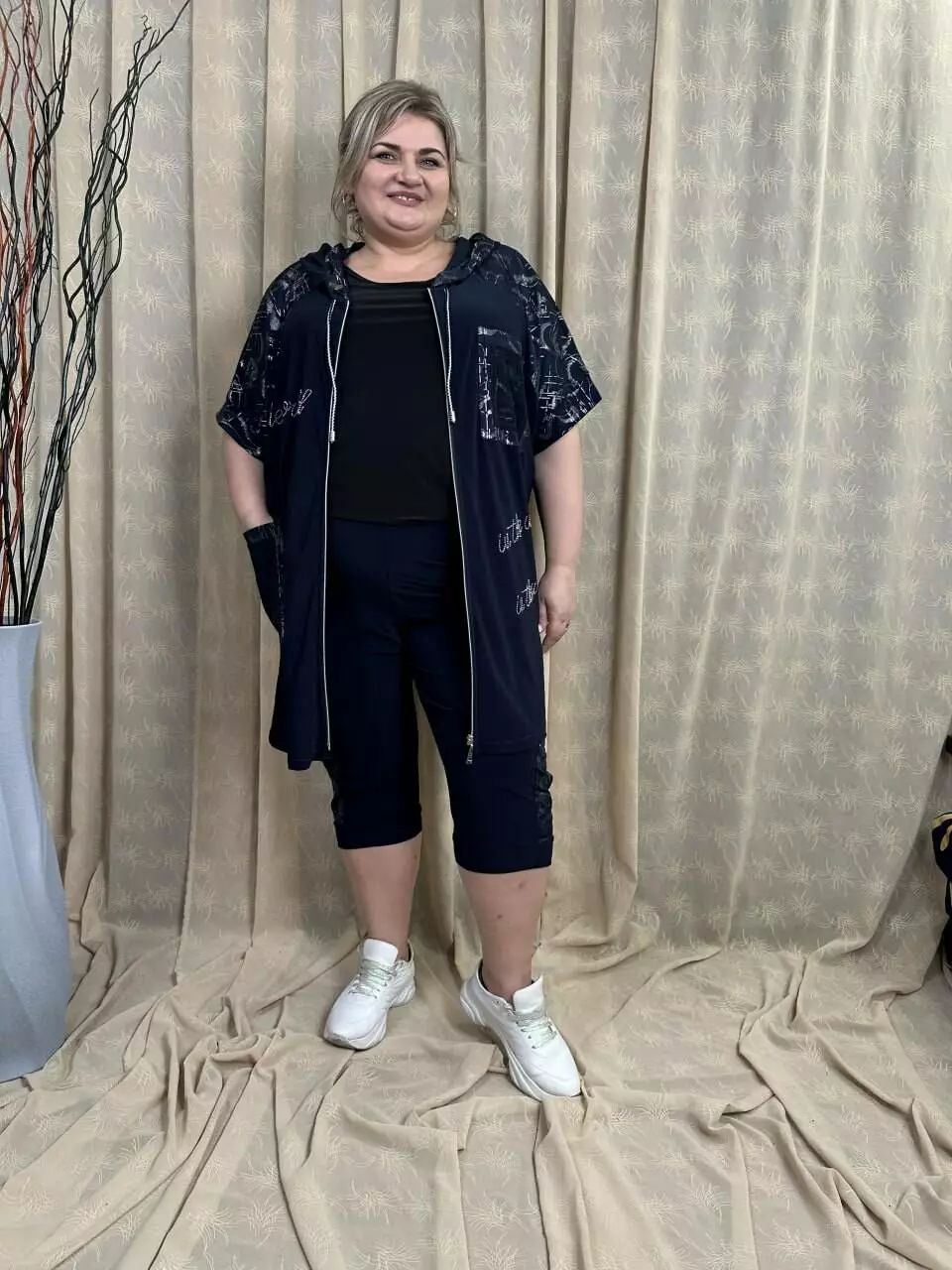Костюм з капрі з корейської олії з дуже гарною розтяжністю. Тканина м'яка, легка, приємна до тіла, не меніться. Туніка на змійці зі спущеним плечем із капюшоном та кишенями. Прикрашена каменевим накатом та оздоблювальною тканиною зі срібним напиленням, яке не зітреться. Капрі широкі з високою посадкою, пояс на резинці.