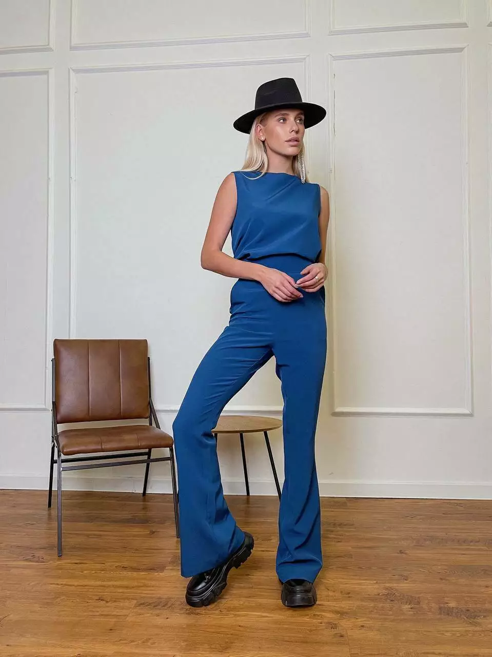 Однотонний комплект LOLA - це ідеальний варіант для стильного та модного вигляду Мінімалістичний та оригінальний костюм складається із топа, який має ідеальну посадку по грудях та вільний в талії, без кишень та застібок Штани мають високу посадку, яка ідеально підкреслить фігуру та клеш від коліна, бічні робочі кишені, застібаються штани на потайну блискавку позаду.