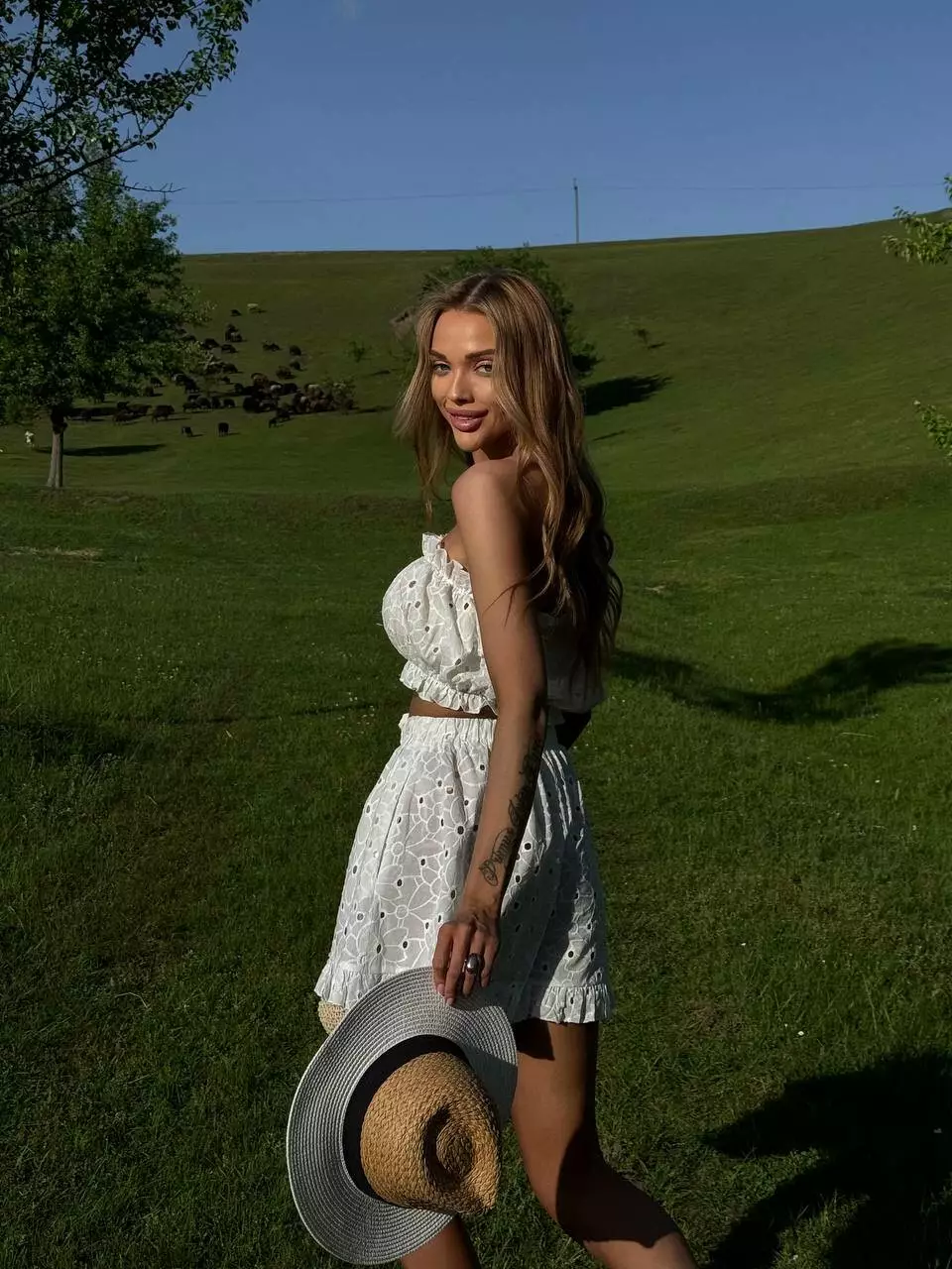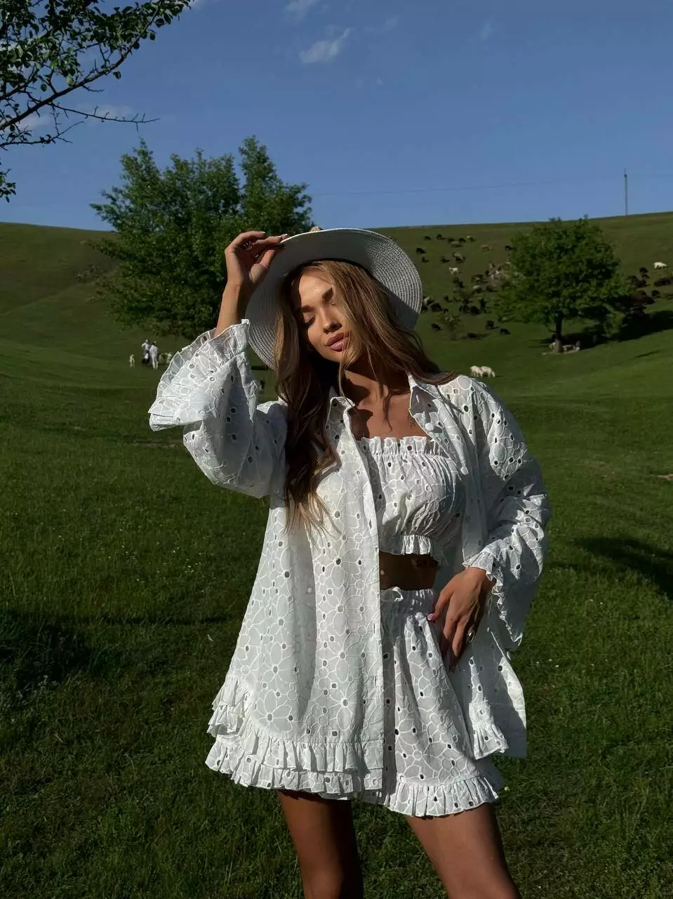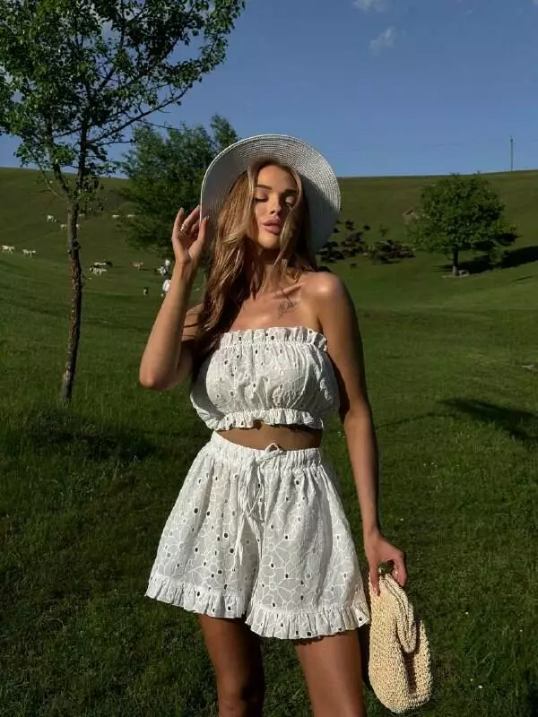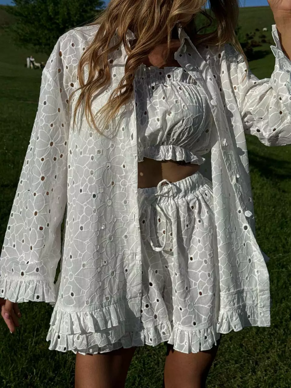 Трендовий костюм з ТРІЙКА: обʼємна сорочка з рюшами по низу, шорти високої посадки з рюшами, топ зі зборкою та пояс в комплекті !