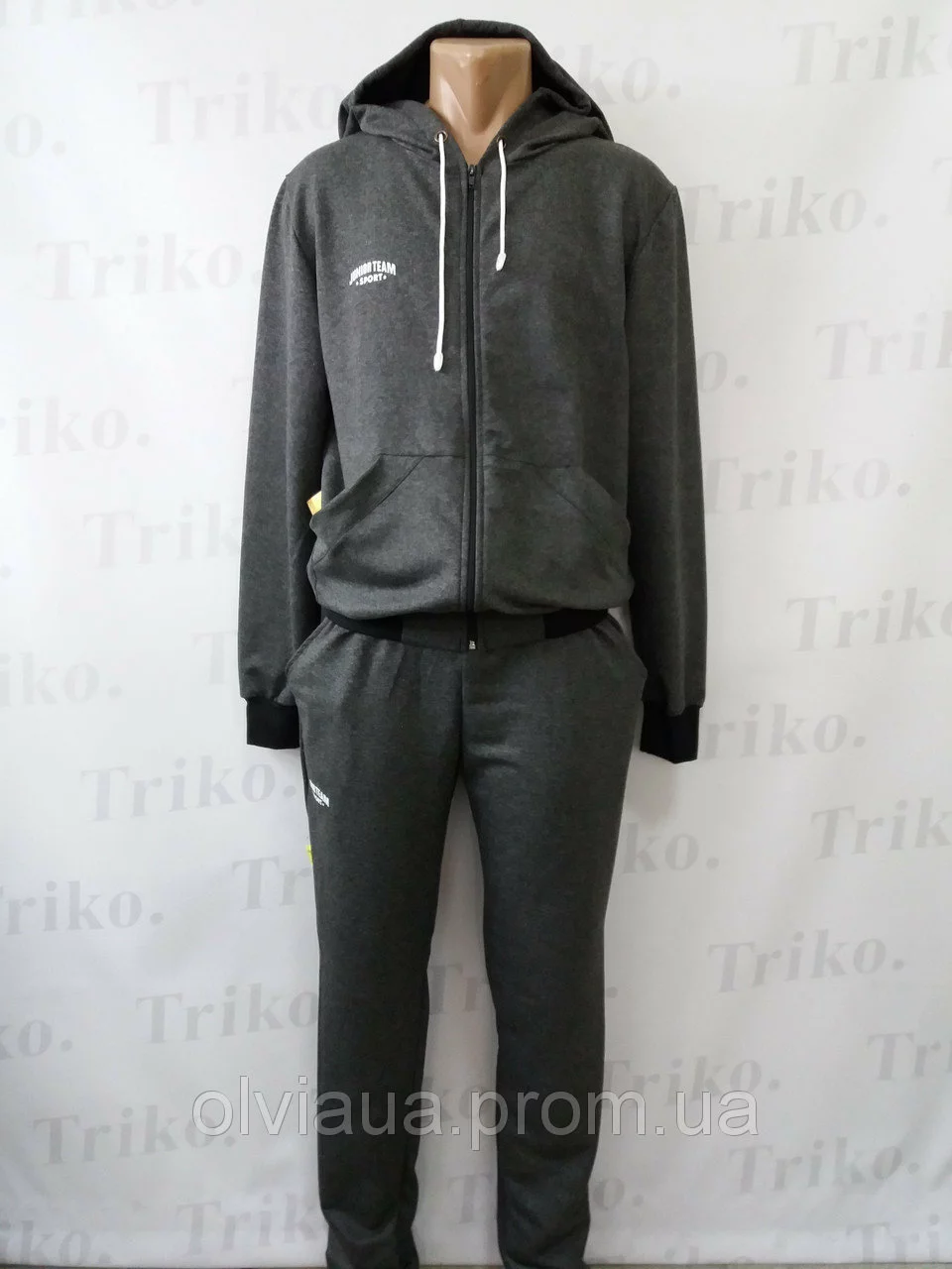 Костюм спортивный . Размер :46,48,50,52,54,56. Кофта на манжетах, с накладными карманами и капюшоном, застежка молния. Штаны прямого кроя. украшен накатом. Полотно : двунитка.