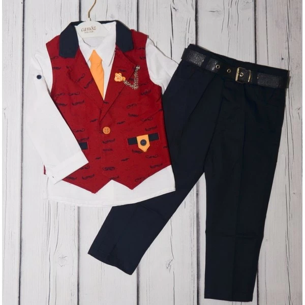 из красной жилетки на пуговице; белой рубашки с ярким галстуком и