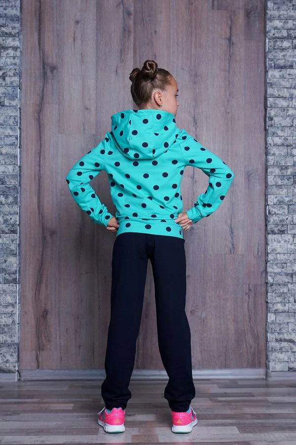 Спортивный подростковый костюм для девочек с капюшоном.Мятная кофта в горох с тёмно-синими штанами,отличного качества,материал-трикотаж двунитка.Этот костюм прекрасно подойдёт девочкам подросткам возрастом с 7 до 11 лет. Данную модель можно использовать как в повседневной жизни так и для активного занятия спортом на природе или в закрытом помещении.