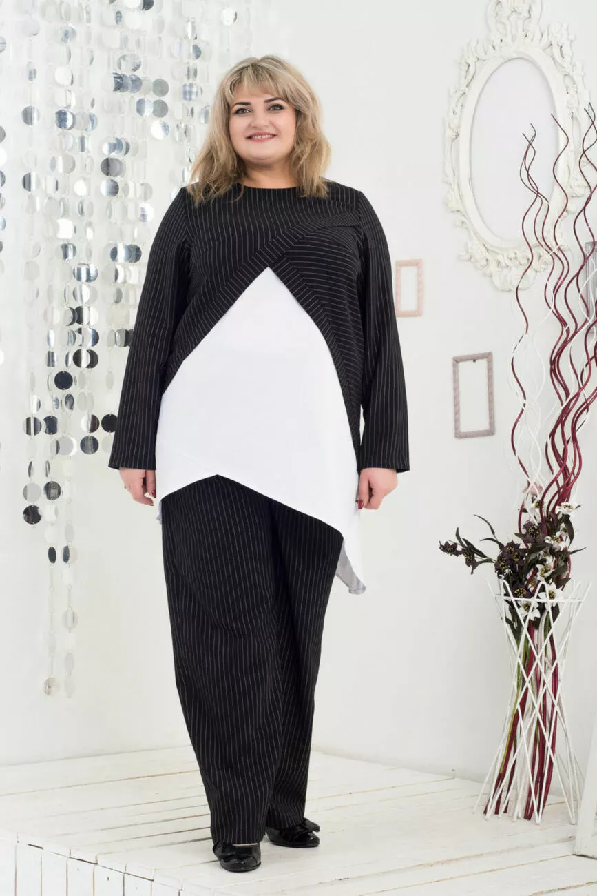 Тканина: джерсі -60% бавовна; 10% поліестер; 30% віскоза. Стильний і модний костюм виконаний з якісної тканини, складається з штанів на резинці та туніки. Туніка візуально з двох частин - однотонної та в смужку. Рукав довгий, горловина заокруглена. Костюм підійде як для ділової зустрічі, так і для вечірки. Міцна, не утворює катишки, мала змінність, не дає усадки, злегка тягнеться. Догляд: делікатний режим прання. Прасувати при температурі не вище 110 мм.