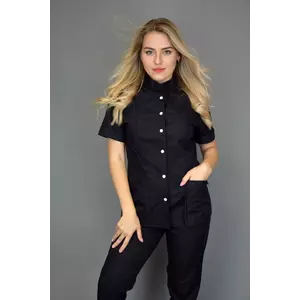 Стильный женский костюм подходит для разных сфер деятельности. На кофте короткий рукав с манжетом. Застежка на белых кнопках. Воротник стойка. Брюки стильного укороченного кроя, зауженные к низу.