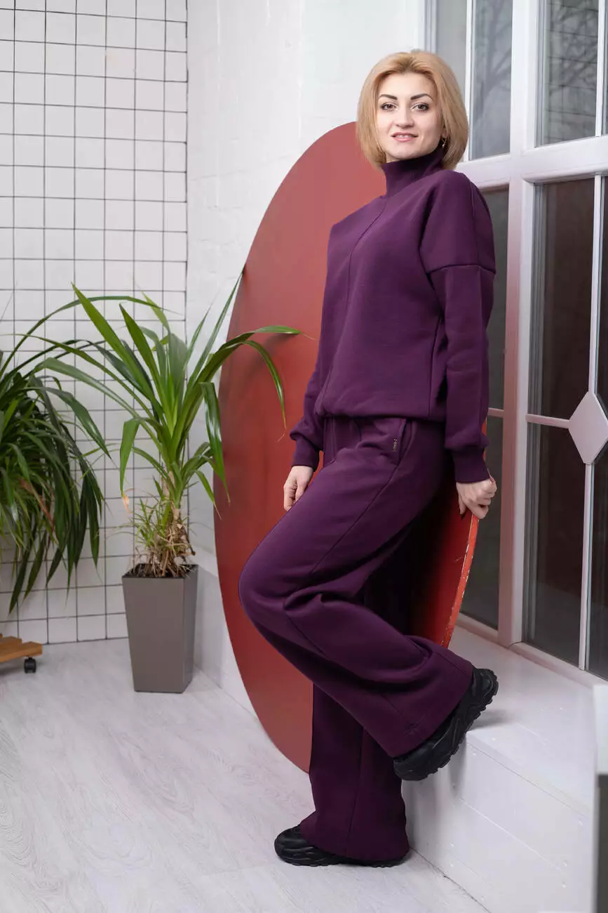 Комплект із світшота oversize з високою горловиною та вільних штанів. Виготовлений із щільного футеру-тринитки. Футер бавовна має м’який внутрішній начіс, що забезпечує тепло в прохолодну погоду. Еластичні манжети, пояс і трикотажна резинка на талії гарантують зручну посадку. Декоративні відстрочки на рукавах, спереду світшота та на штанинах додають виробу фактурності. Ідеально підходить для міжсезоння.