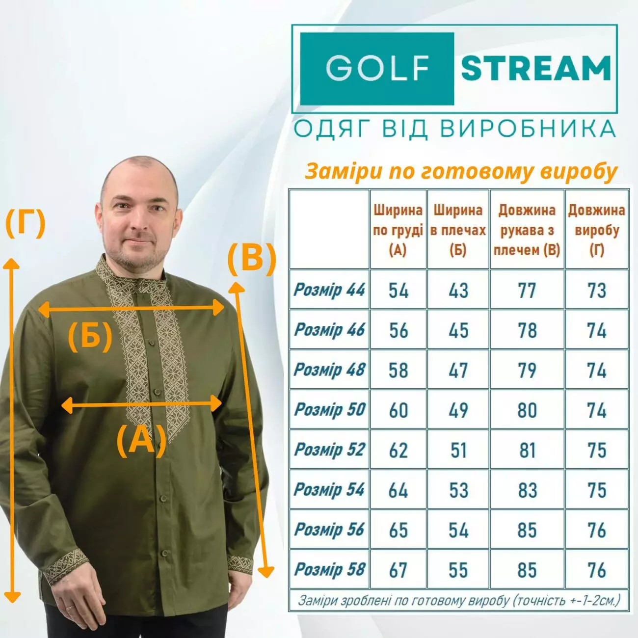 Вишиванка вільного покрою,  застібається на ґудзики. Рукав довгий на манжеті.