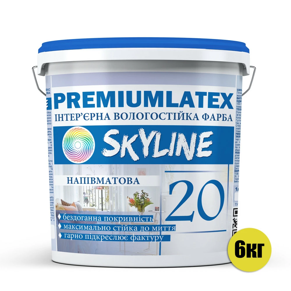 Акрил латексная полуматовая краска Премиум латекс 20 Скайлайн разработана для окрашивания поверхностей внутри помещений, и может быть нанесена на любые покрытия, даже алкидные эмали. Краска обладает непревзойденной укрываемостью, идеально подчеркивает структуру поверхности, придавая ей лёгкий сатиновый блеск. Покрытие после высыхания выглядит необычно, стильно, и, самое главное, прослужит дольше чем любая другая интерьерная краска. Premiumlatex Skyline обладает наивысшей степенью к истиранию,  ее без особых усилий можно протереть или помыть уборочными приспособлениями с водой или даже с использованием моющих средств. После влажной уборки не остаётся ни малейшего следа разводов, а покрытие как будто только что нанесено, сохраняя свой первозданный блеск, привлекательный вид и стойкость на долгие годы.