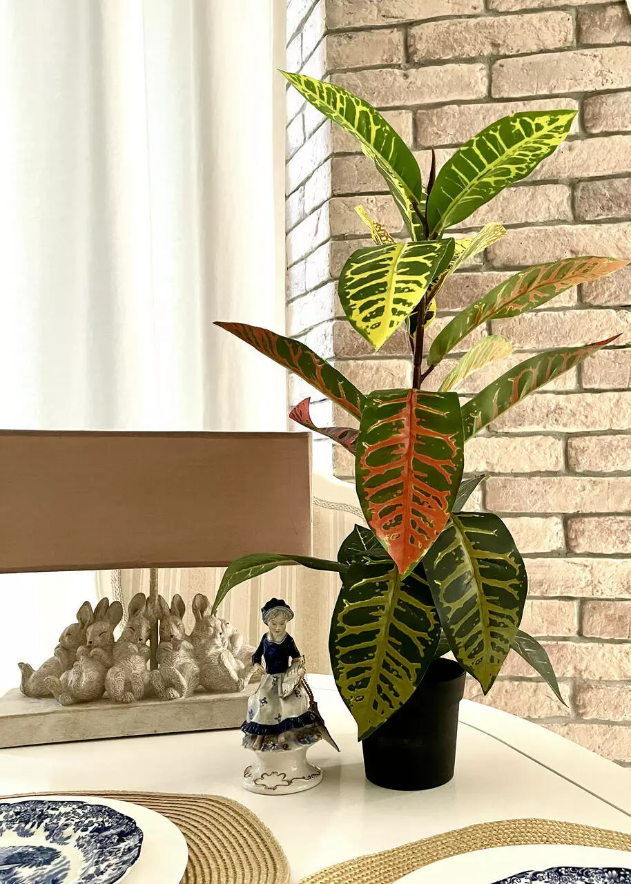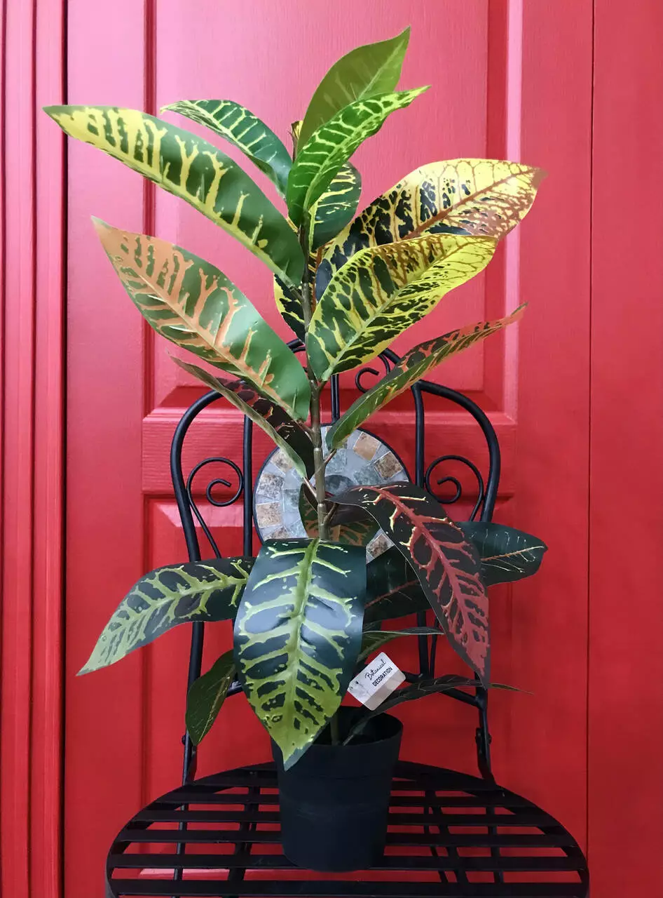 Завдяки цій штучній рослині ви зможете створити атмосферу природної краси в будь-якому інтер'єрі, навіть там, де це було б неможливо для живої рослини. Насолоджуйтеся всією привабливістю кротону без необхідності турботи про її догляд.