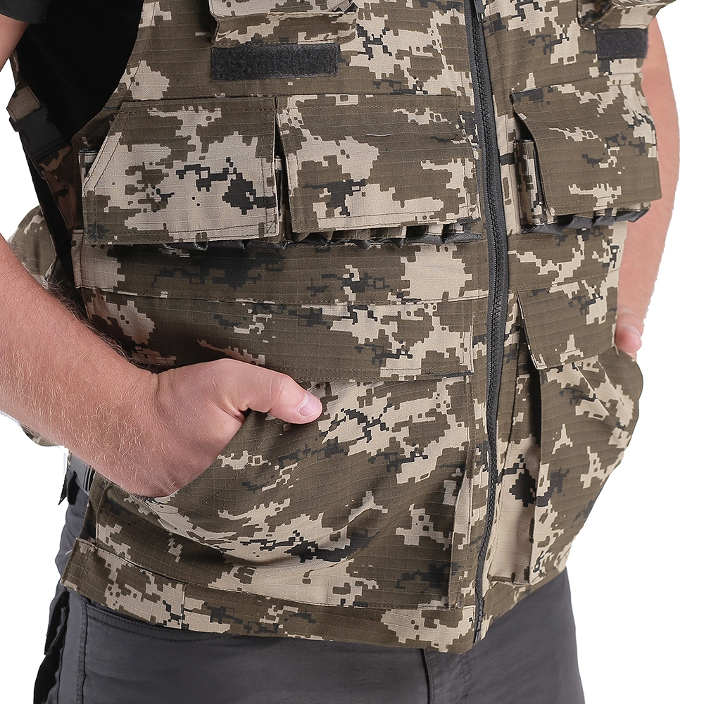 Жилет "Охотник 20". Универсальный жилет с 44 по 60 размер, размер регулируется за счет боковых пряжек. Пошит из смесовой камуфляжной ткани "Рип Стоп" на подкладке. Может использоваться как для летней так и зимней охоты. Удобно размещен патронташ на 20 патронов. Имеются два внутренние кармана (на липучке) для документов, два нагрудных объемных кармана (на липучке), два нижних объемных кармана (на липучке) + два кармана с боковым входом. На спине большой объемный карман для дичи (в виде сумки) на кнопках, а так же на спине имеется сигнальный клапан (откидной) яркого цвета для безопасной охоты в условиях плохой видимости. Жилет может быть изготовлен по желанию заказчика, под любой калибр патронов. Срок выполнения заказа 2-3 дня. Рассматриваем и выполняем индивидуальные проекты.