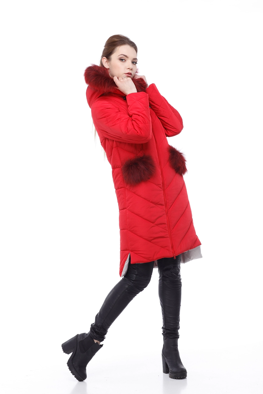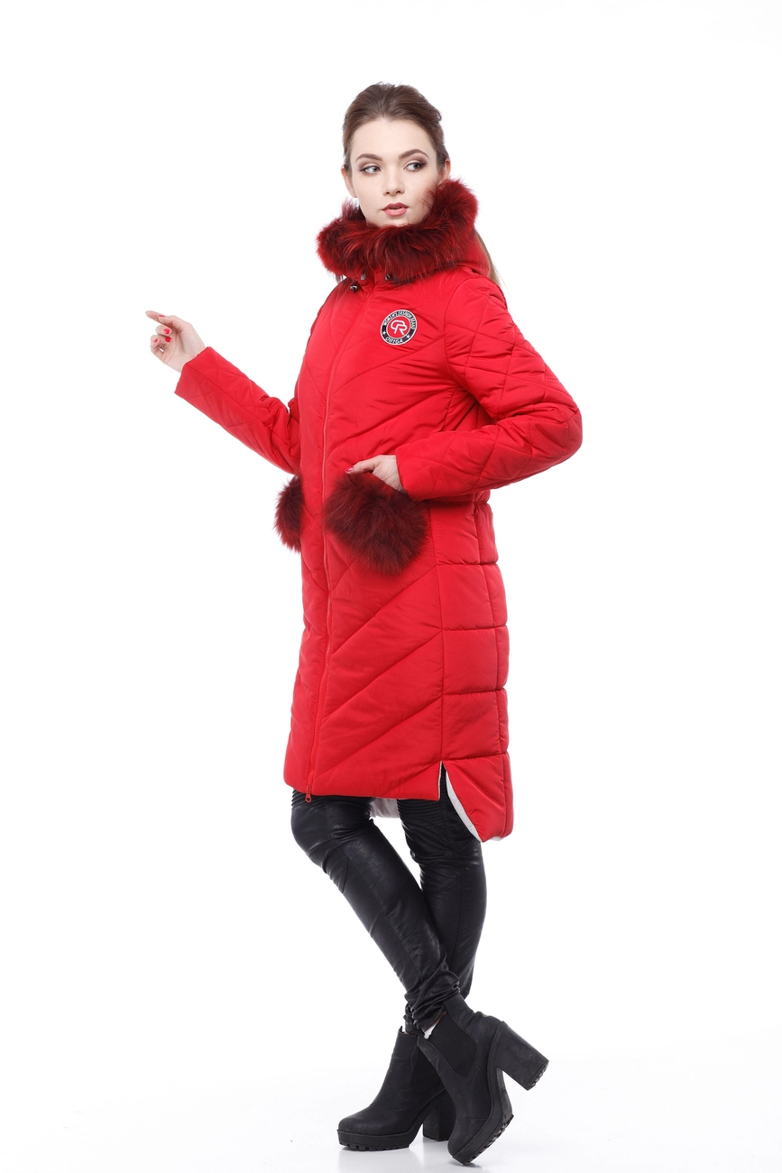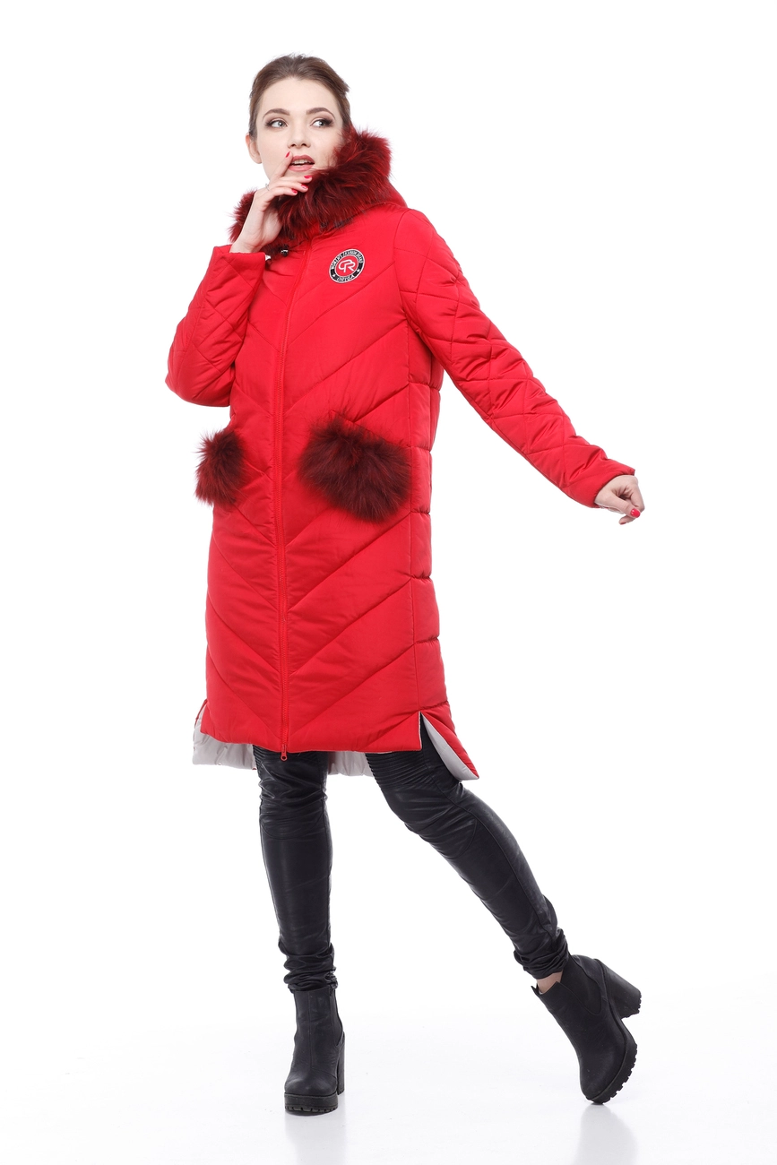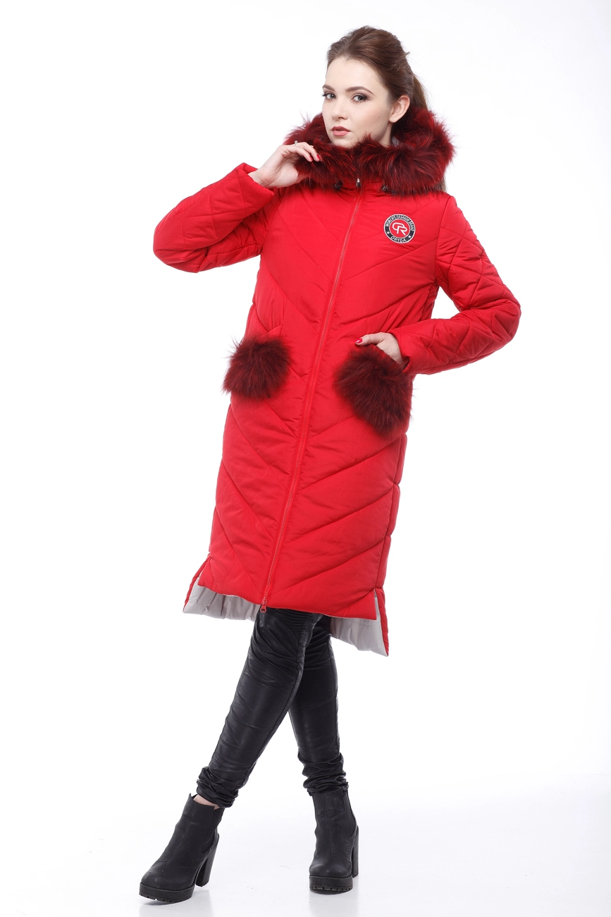 Зимнее пальто Монтана енот в цвете с опушкой (ярко-красный)