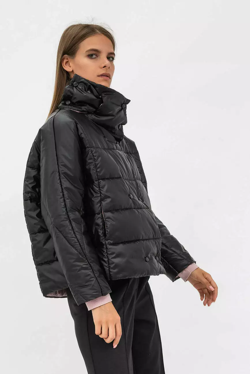 Стьобана, пошита з плащової тканини з двобортною застібкою. Модель