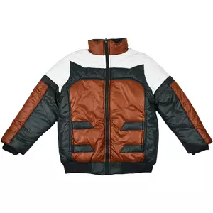 Теплая демисезонная куртка с флисовой подкладкой. Поверхностный слой изделия изготовлен из не продуваемого синтетического материала – полиэстера и оформлен в стильном цветовом сочетании коричневого, зеленого и белого цветов. Между флисовой подкладкой изделия и не продуваемым слоем куртки расположен войлочный наполнитель, который улучшает теплоизоляционные свойства изделия и исключает развитие плесневых грибков на фоне повышенной влажности одежды, которая находится ближе к телу.